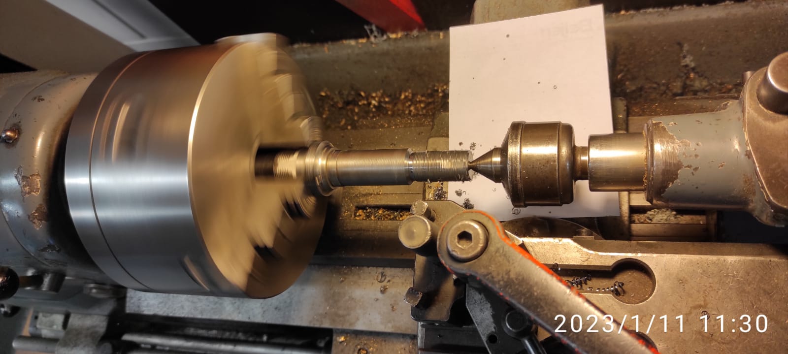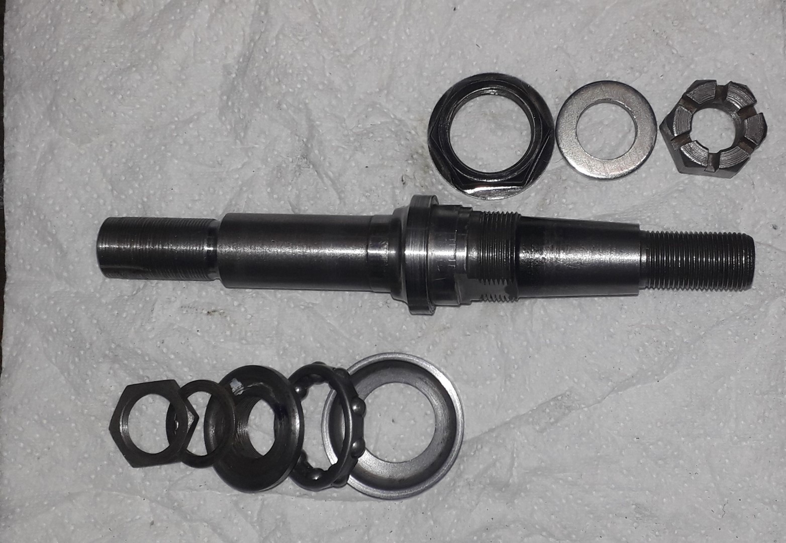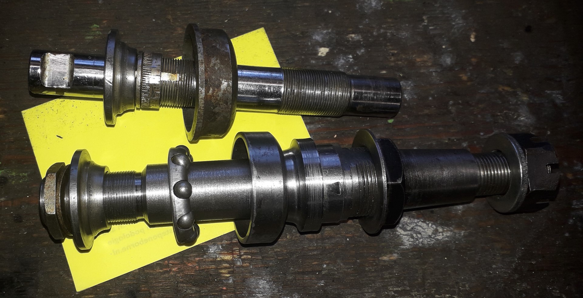 Het enioge wat dan nog moet gebeuren is de linkse draad van de trapas overnemen op mijn wielas. Helaas kan ik zelf geen schroefdraad snijden op mijn draaibank, maar altijd mooi als je een broer hebt die dat wel kan. Rob bedankt! Bovenste as de wielas met nog een origineel cupje (as heeft linkse draad)
