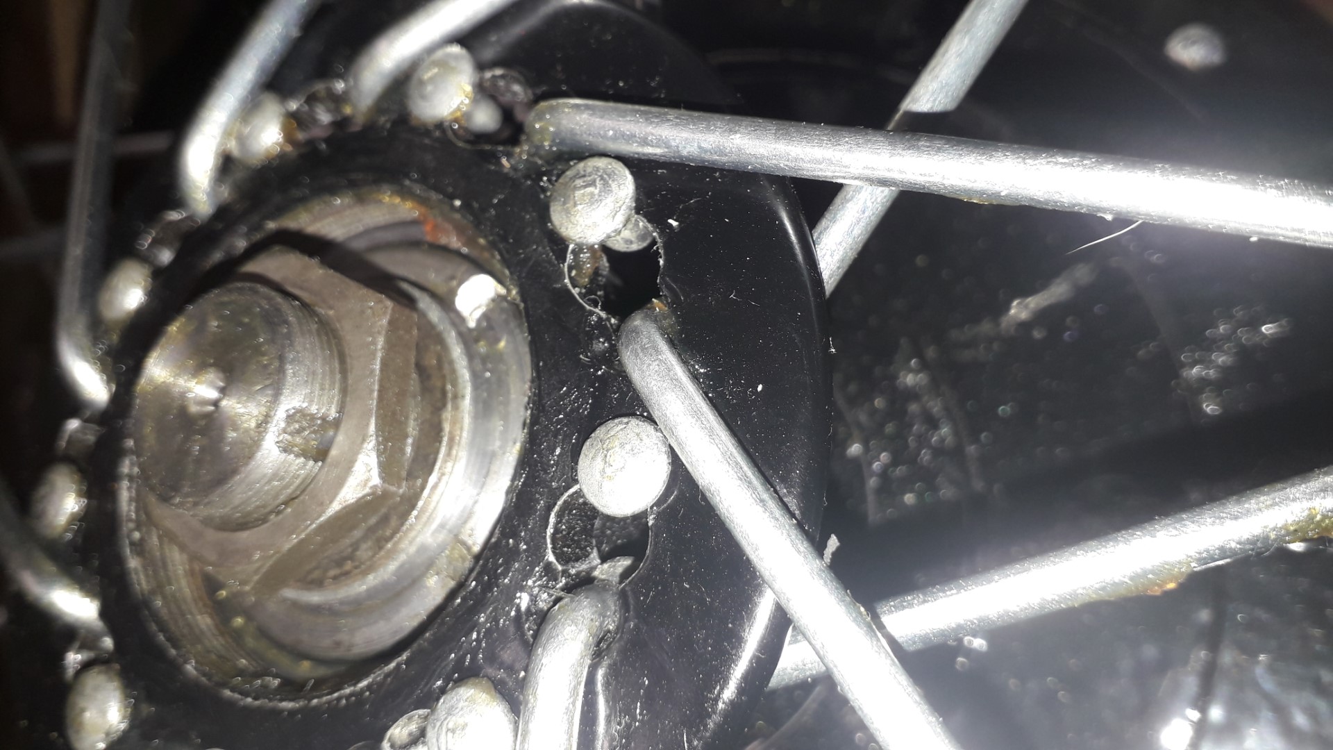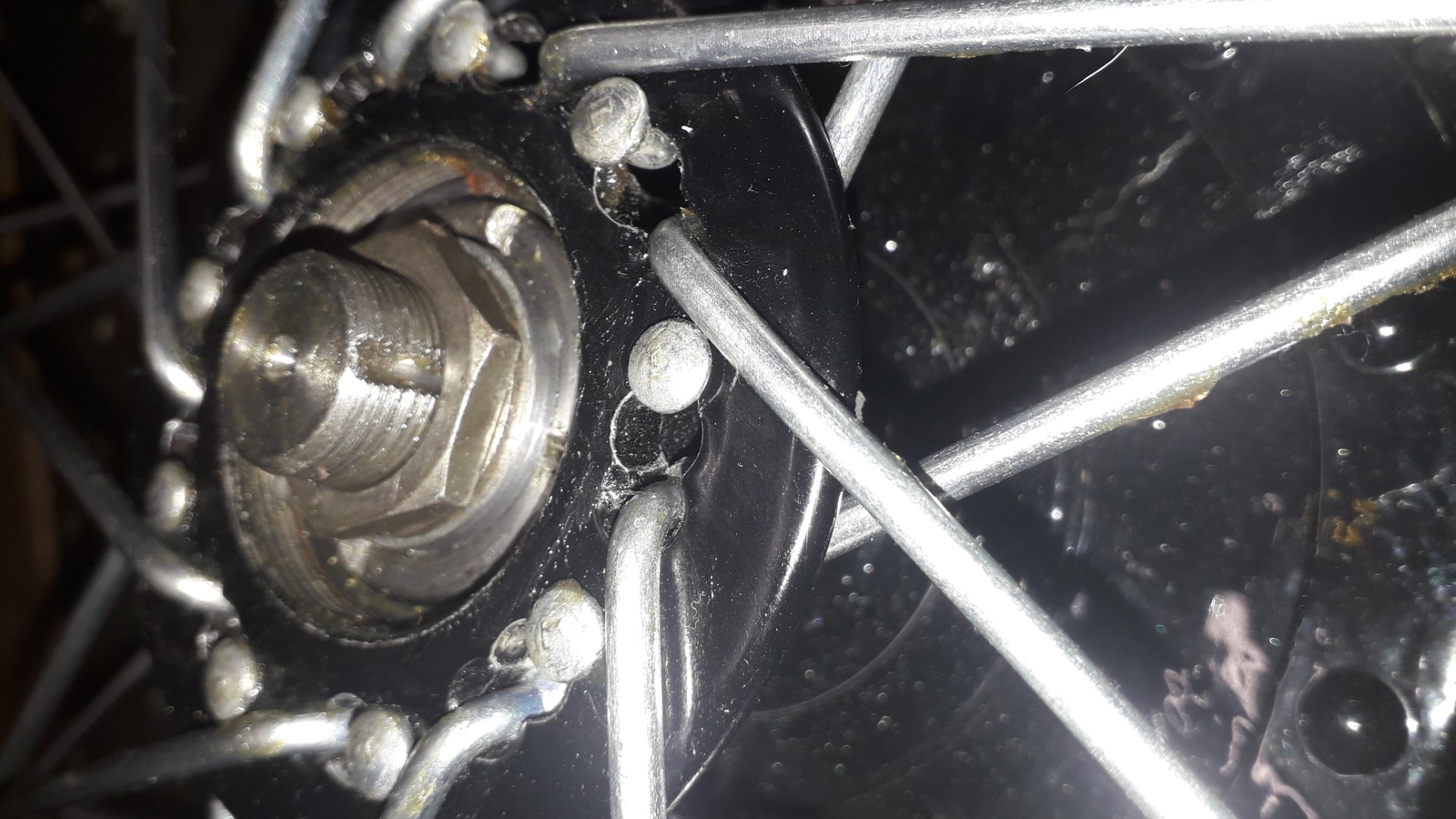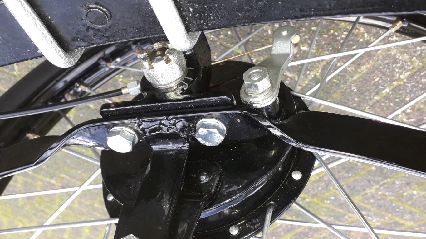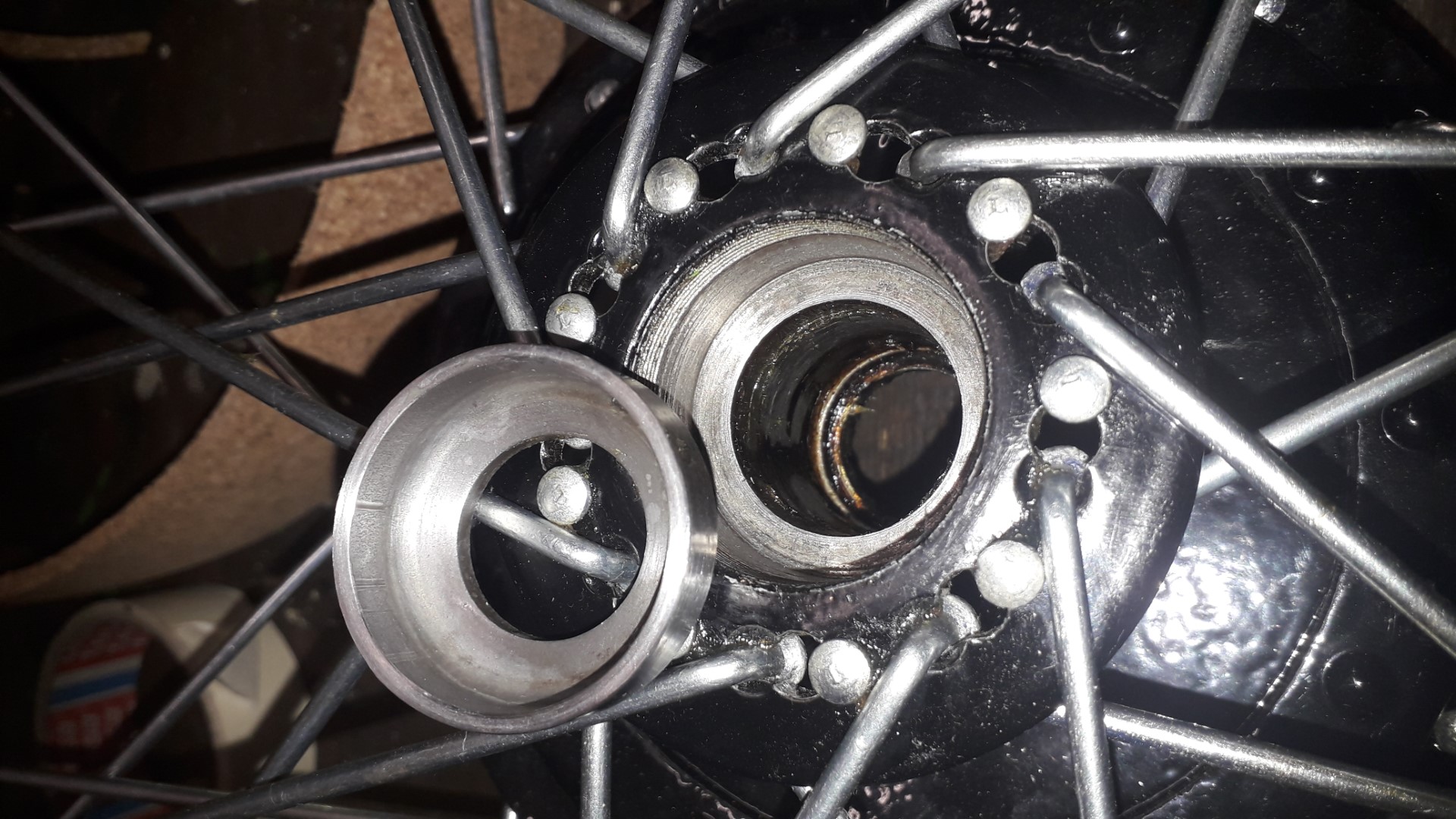 Op deze foto de aangepaste as met de losse onderdelen: Na een beetje stoeien en fröbelen kan ik eindelijk mijn andere wiel ook weer opbouwen en gereedmaken voor montage: