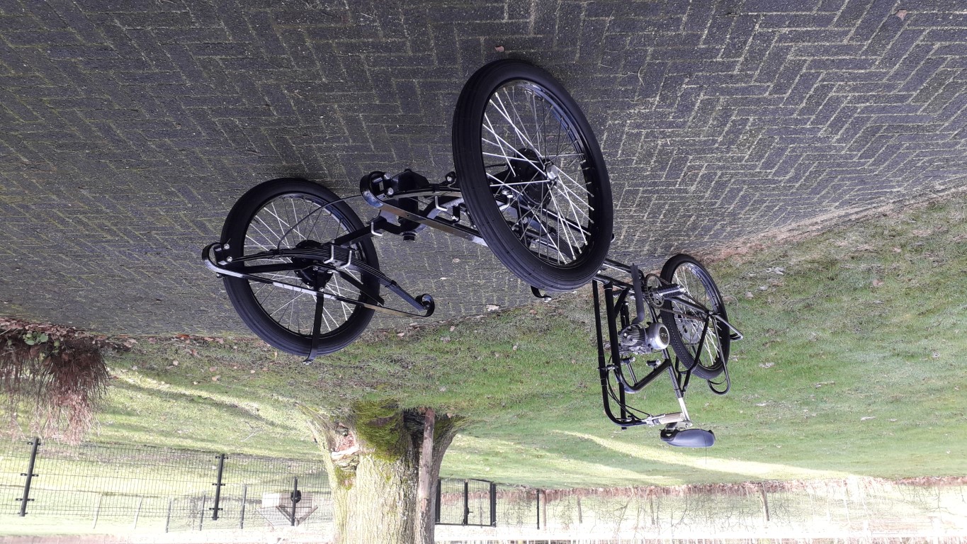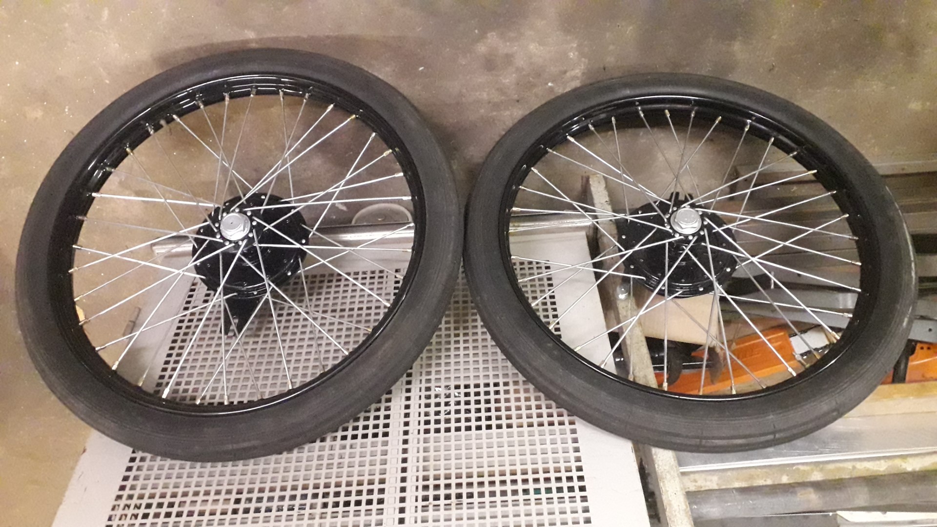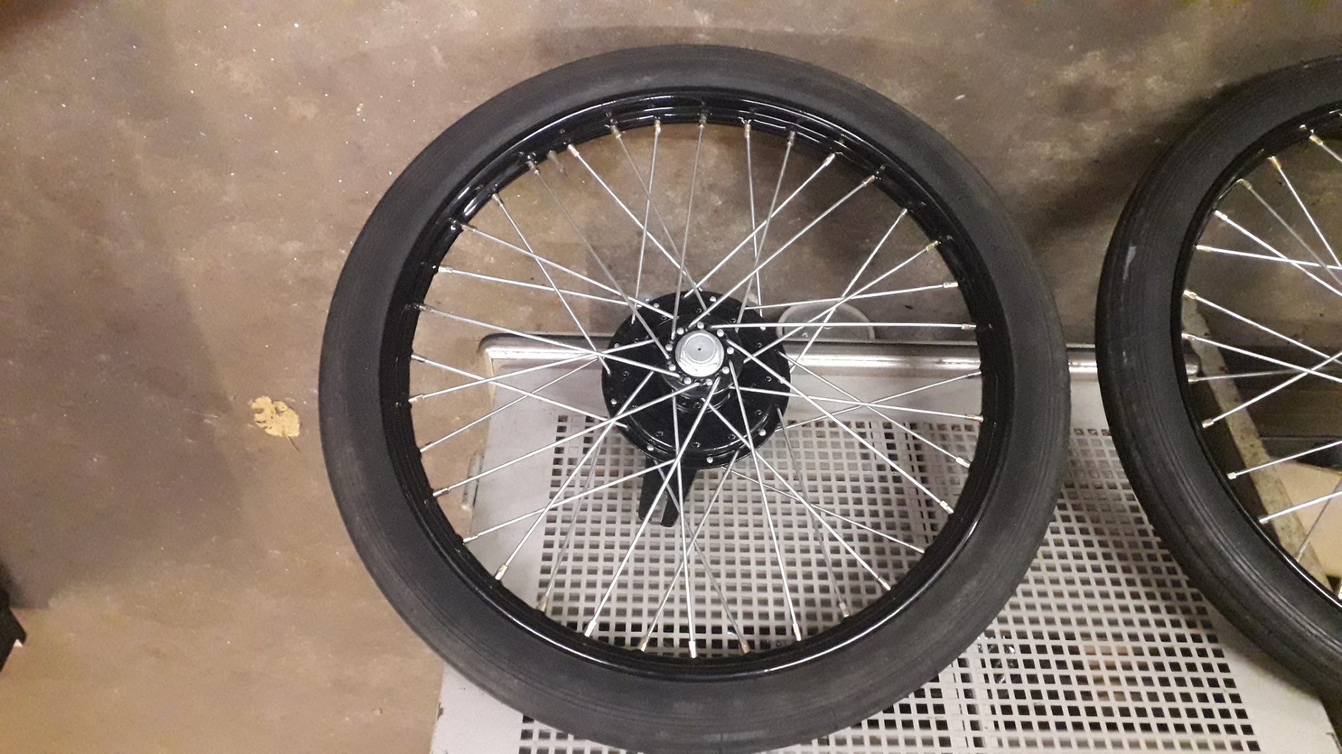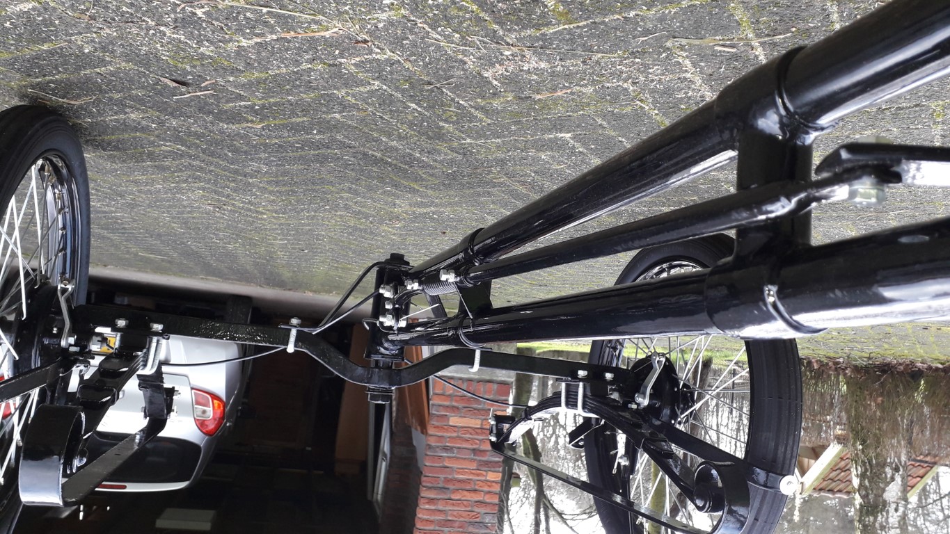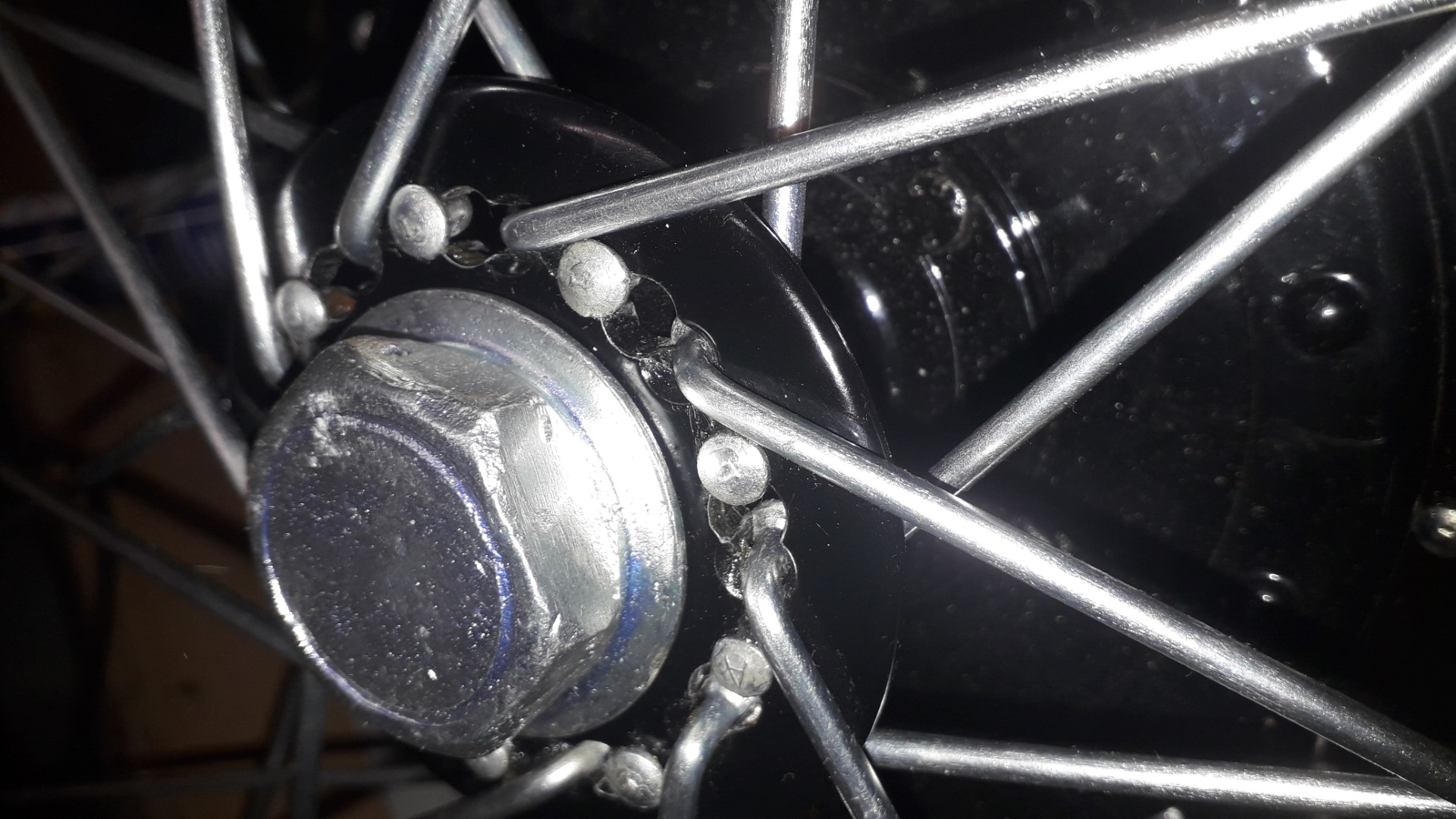 Op deze foto de aangepaste as met de losse onderdelen: Na een beetje stoeien en fröbelen kan ik eindelijk mijn andere wiel ook weer opbouwen en gereedmaken voor montage: