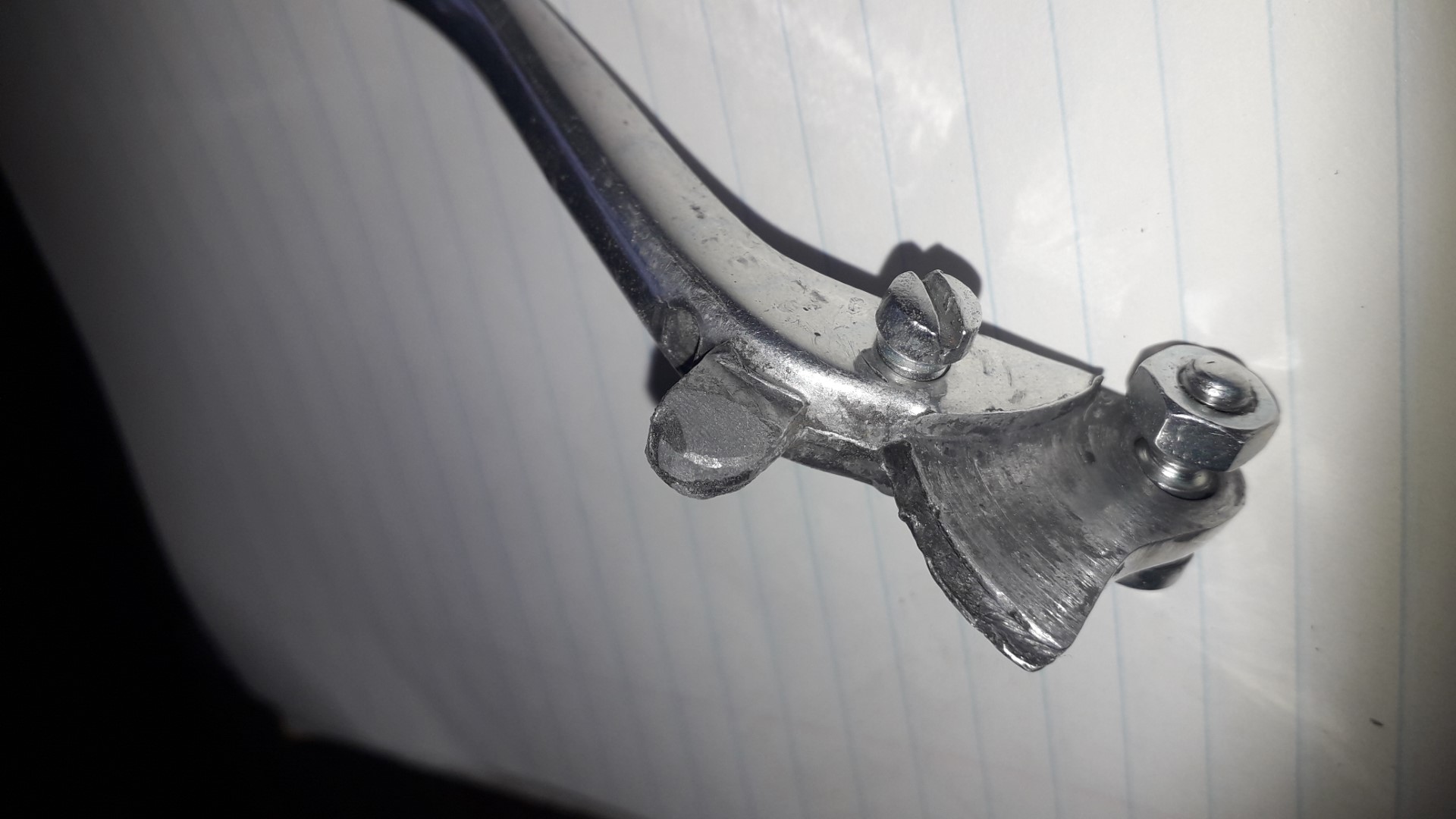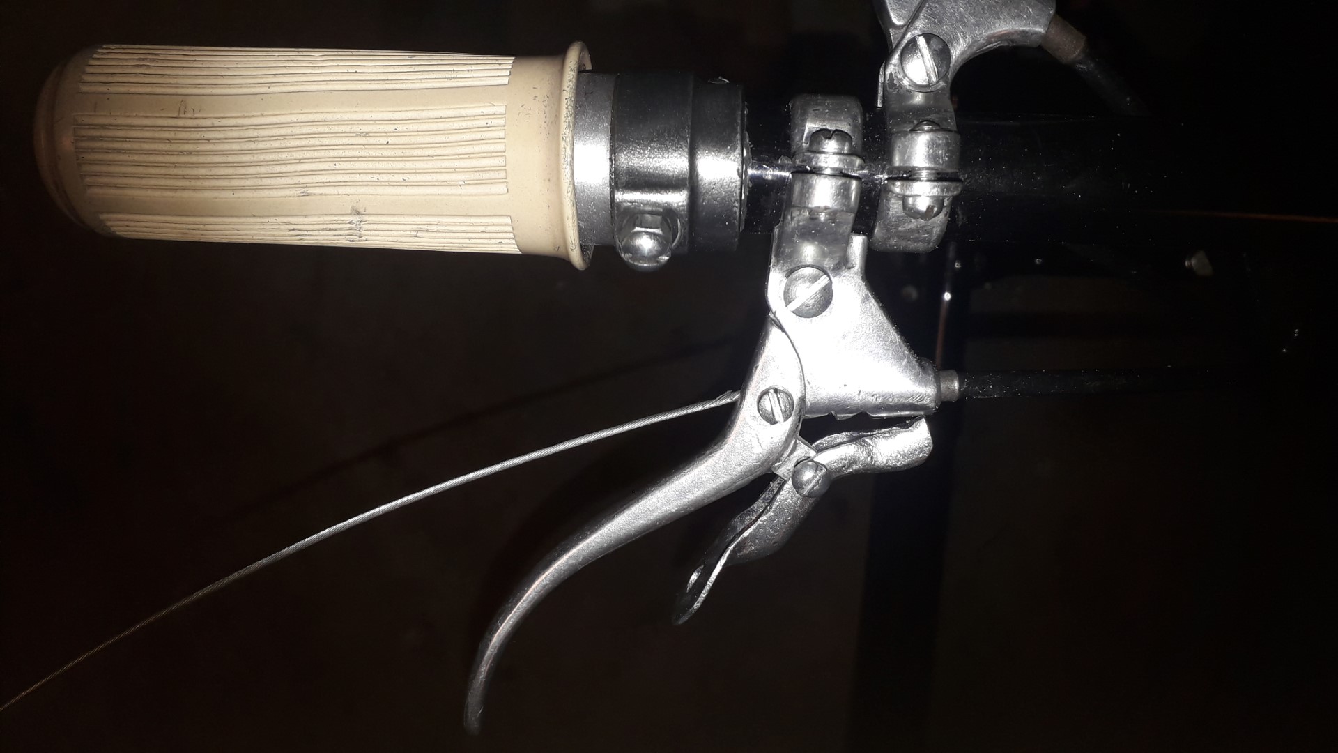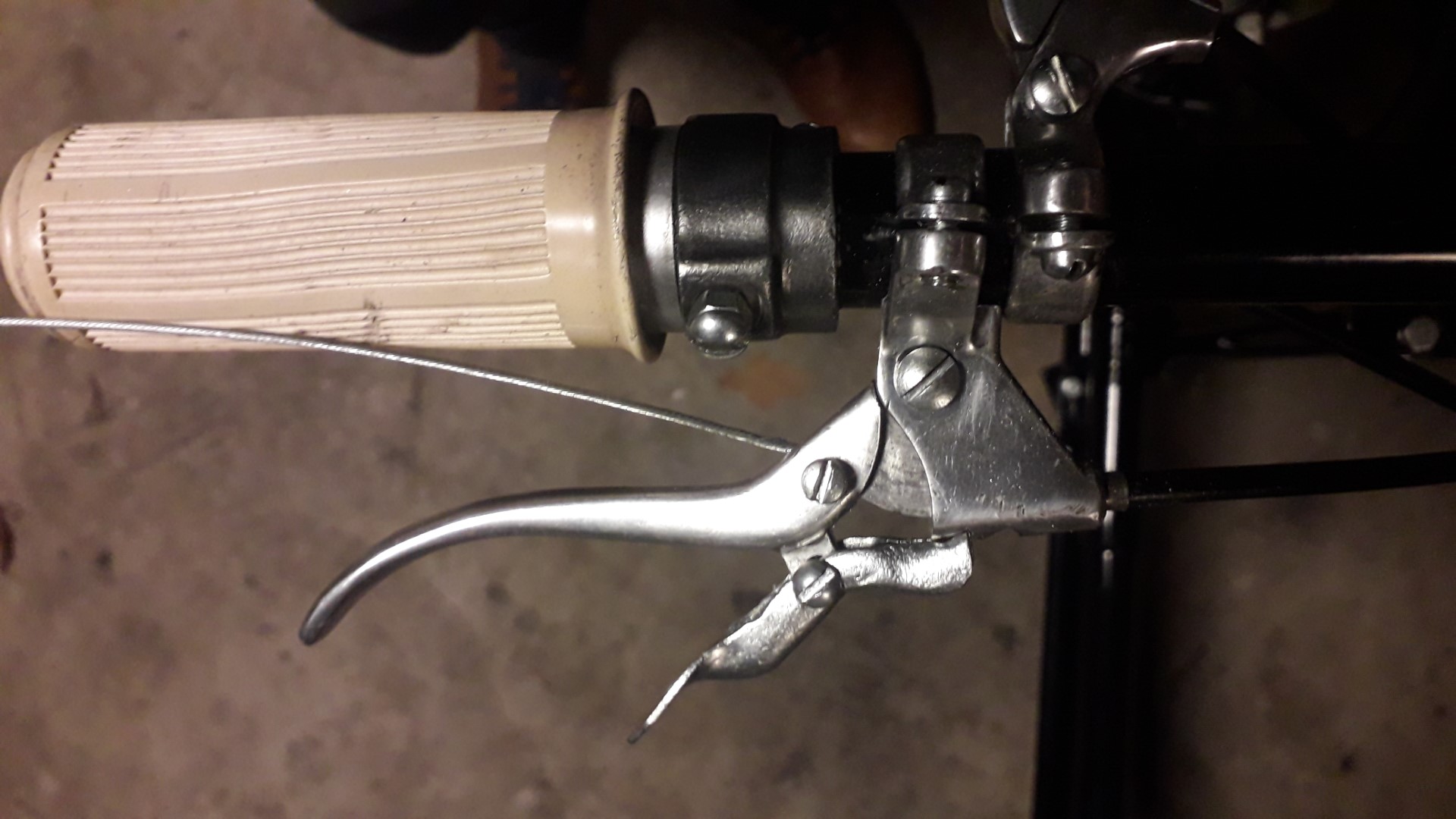 Indien de motor loopt, en je staat even stil, bijv. voor een verkeerslicht, is het mogelijk het motortje in zijn "vrij" te zetten, d.m.v. een hendeltje ààn de koppelingshendel. Het aluminiumoogje wat daarvoor aan de koppelingshendel is aangebracht was behoorlijk "uitgelubberd". Om problemen in de toekomst te voorkomen heb ik met 2 componenten alumniumpasta het gaatje eerst opgevuld, vlakgemaakt en vervolgens een nieuw gaatje ingeboord. Een nieuwe binnenkabel voor de koppeling gemaakt en het zwikkie maar eens gemonteerd. Ook dat is weer opgelost.