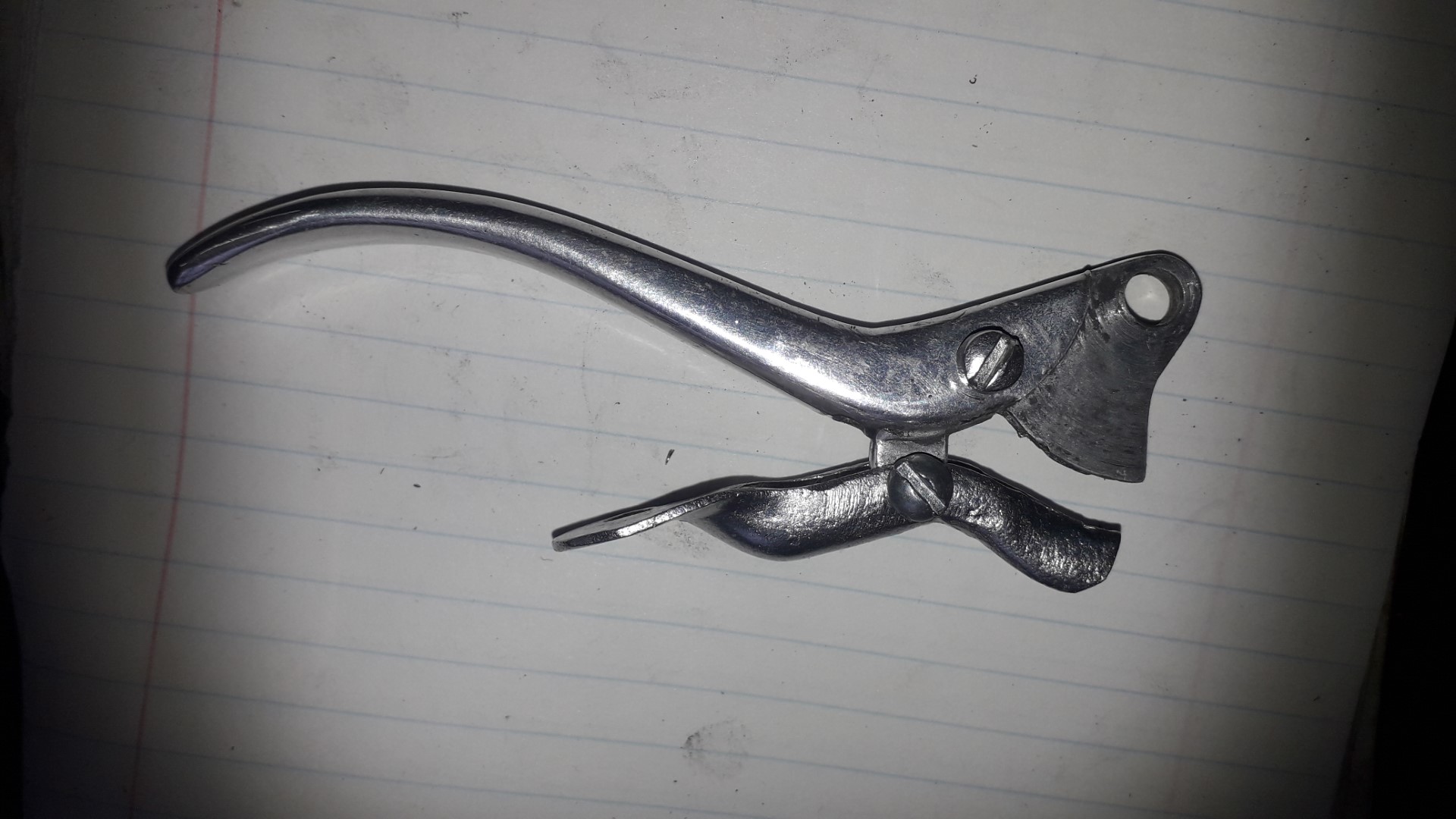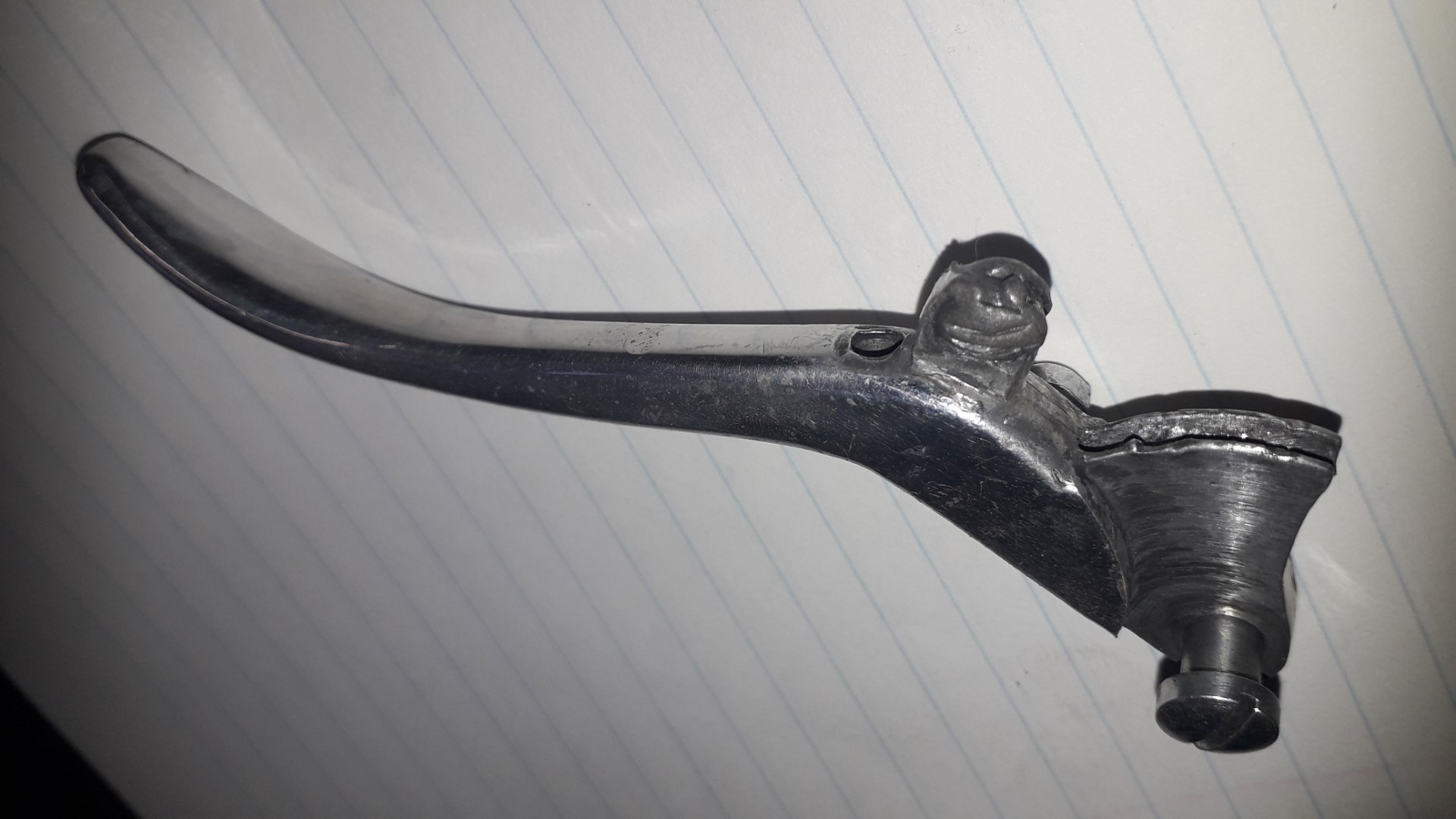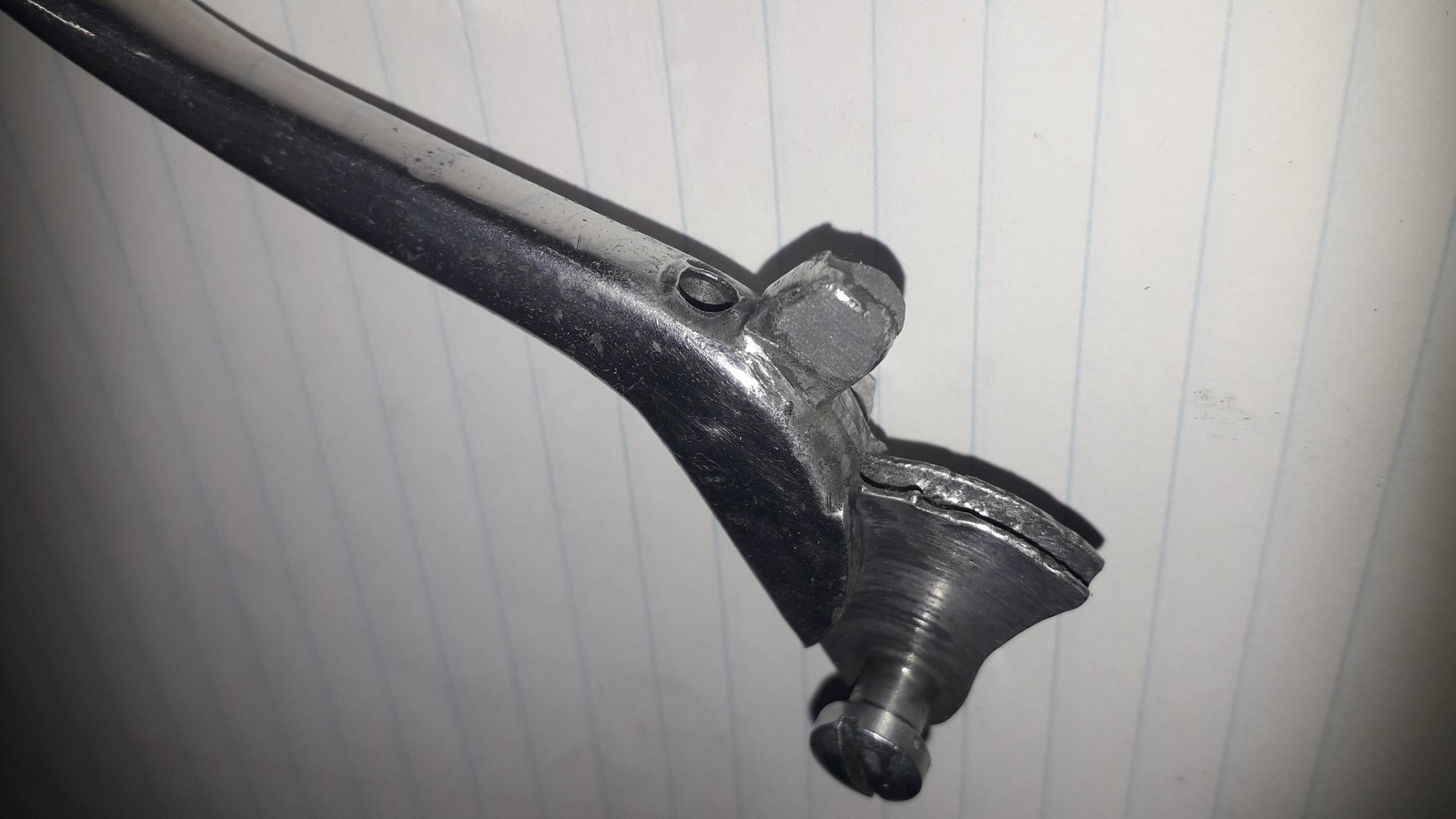 Indien de motor loopt, en je staat even stil, bijv. voor een verkeerslicht, is het mogelijk het motortje in zijn "vrij" te zetten, d.m.v. een hendeltje ààn de koppelingshendel. Het aluminiumoogje wat daarvoor aan de koppelingshendel is aangebracht was behoorlijk "uitgelubberd". Om problemen in de toekomst te voorkomen heb ik met 2 componenten alumniumpasta het gaatje eerst opgevuld, vlakgemaakt en vervolgens een nieuw gaatje ingeboord. Een nieuwe binnenkabel voor de koppeling gemaakt en het zwikkie maar eens gemonteerd. Ook dat is weer opgelost.
