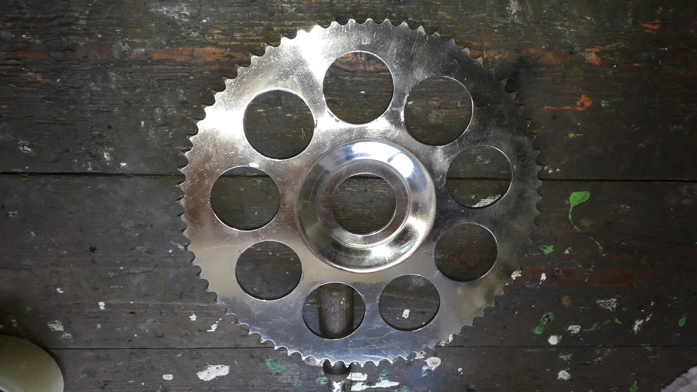 Het tandwiel bleek vernikkeld te zijn, dus heb hem maar even "gepoetst". Een beetje "bling-bling" mag er ook wel bij.