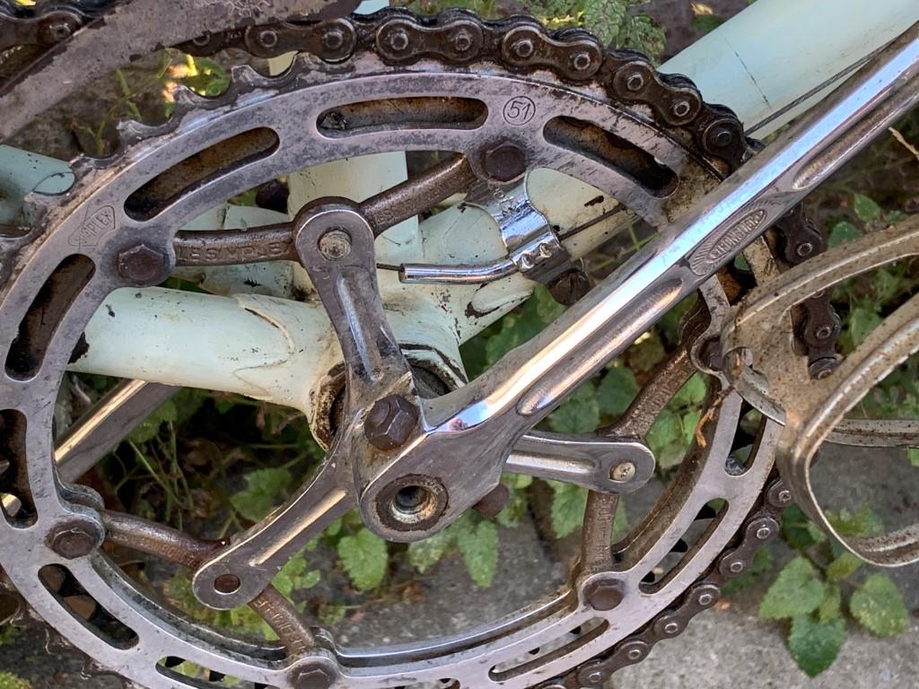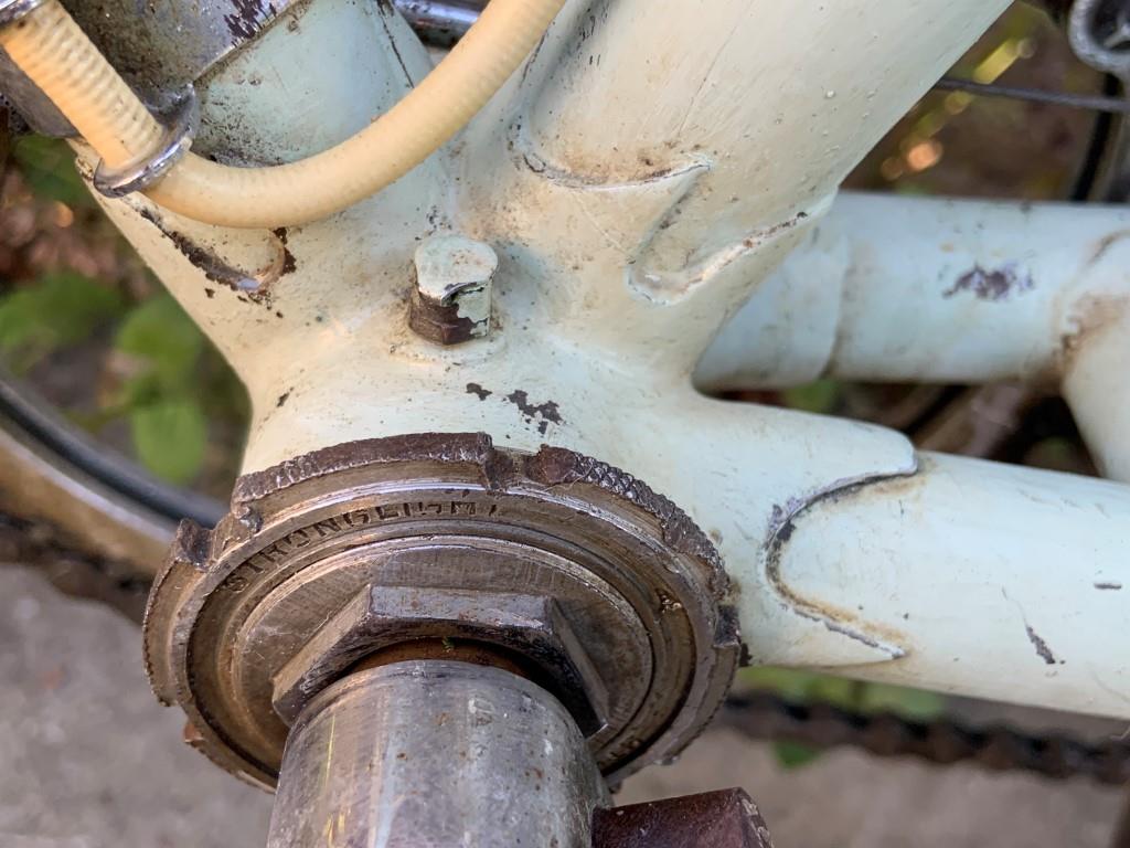 Mijn vermoeden is wel dat het balhoofdstel, trapas en crankstel (niet de tandbladen!) en zadel erg oud kunnen zijn. Jammer alleen dat de montagering van de trapas met een drevel of schroevendraaier is beschadigd. Dit gebeurt helaas vaker, maar was niet nodig geweest.