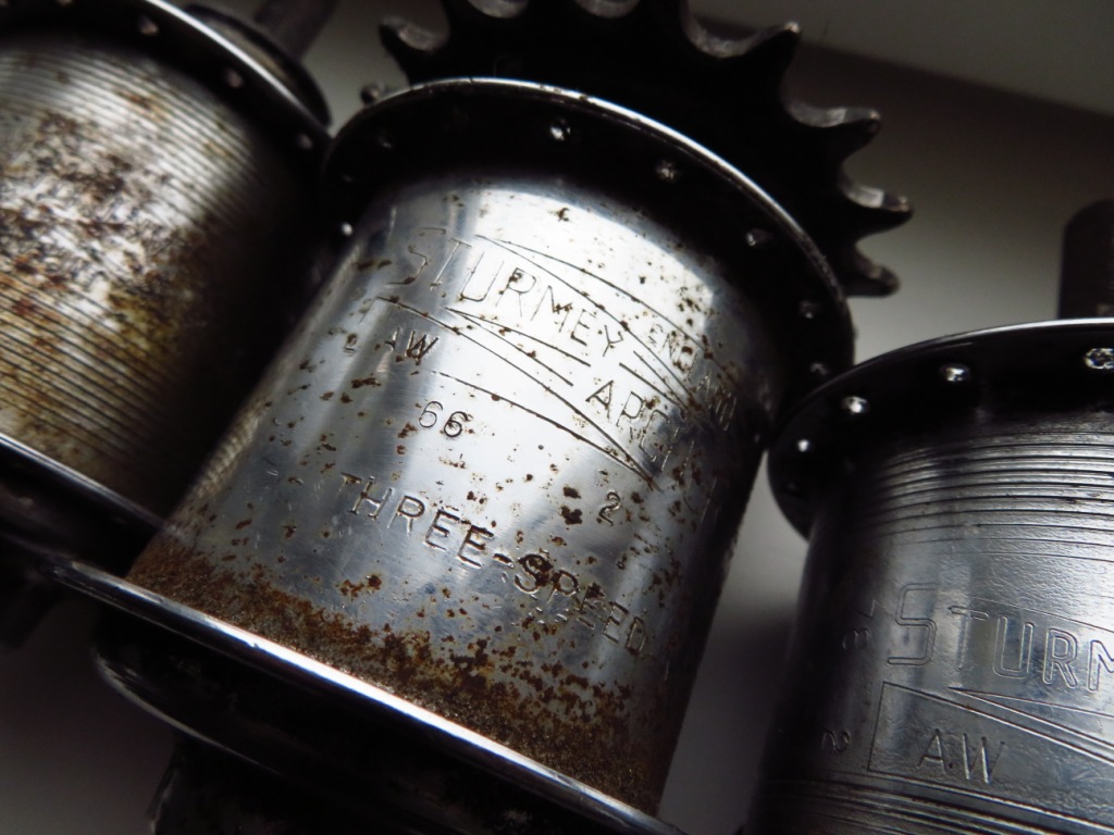 -3x Sturmey Archer type AW (3speed freewheel rear hub, 36 gaats) uit 1966, 1976 en 1978.