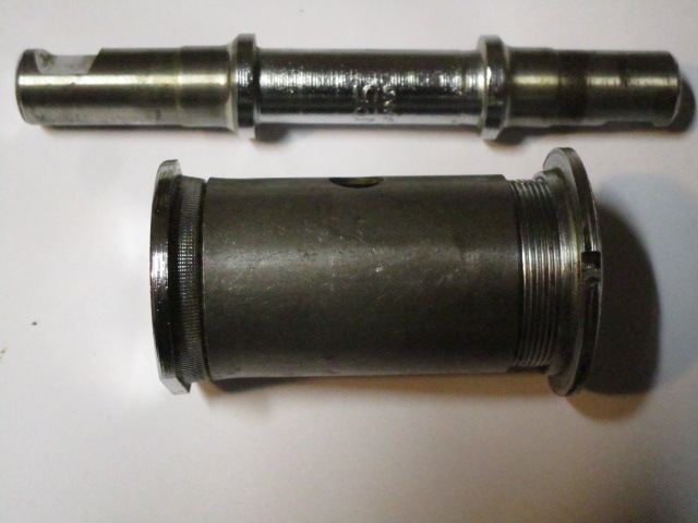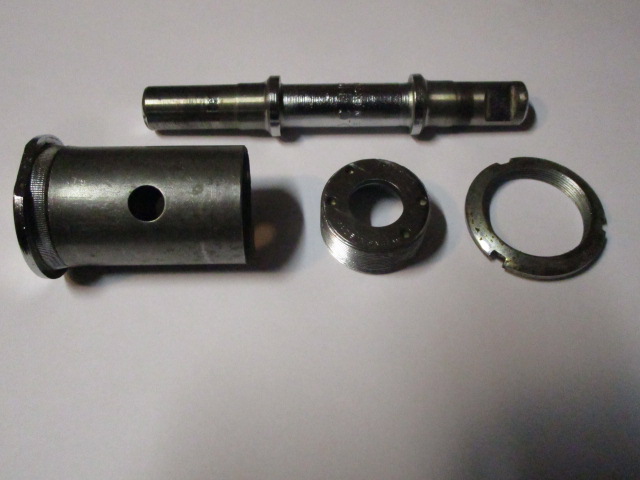 Uit een PFG Fongers, bouwjaar 1963. Bij dit type as, zit in het frame geen schroefdraad. Hij wordt geklemd, tussen de ribbels op de linker cup en de ringmoer.
