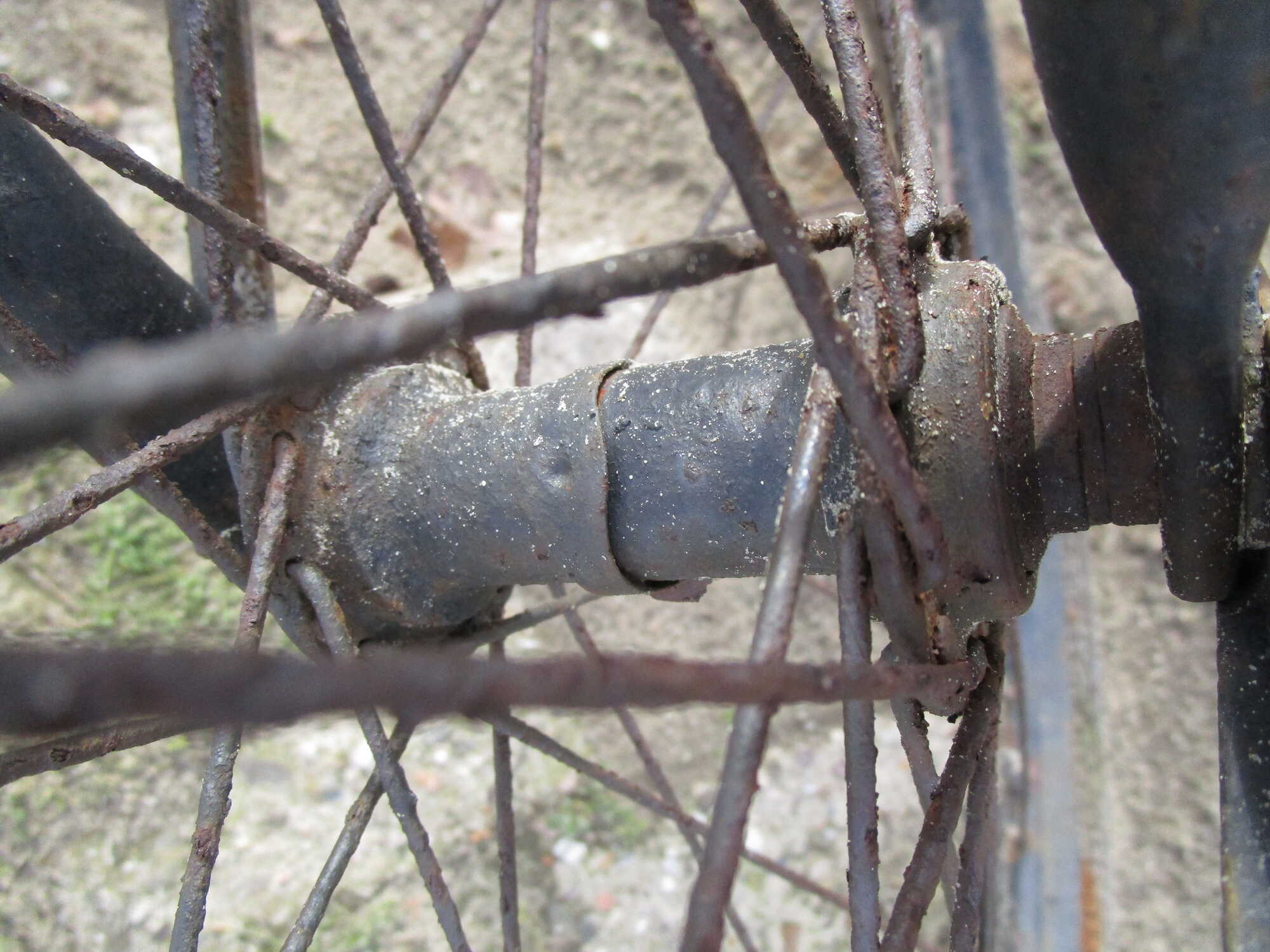 De vooras lijkt uit twee over elkaar geschoven delen te bestaan. Kan iemand iets zeggen over die constructie? [Naschrift: een klemmetje op het oliegat - JZ] De linker kant (rechts) heeft trouwens een klein gaatje. En klik eens op de foto om die slechte spaak beter te bekijken ...