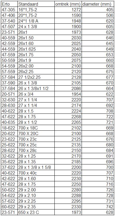 Omdat er zoveel mensen willen weten hoe hard ze fietsen hebben ze allemaal een kilometertellertje gekocht, en daar moet je na aanschaf op instellen wat de omtrek van je wiel is, uiteraard inclusief band. Omdat fietsenmakers het snel zat zijn iedere keer dezelfde vraag te beantwoorden zijn er op diverse plekken lijstjes van te vinden (al is zelf meten nauwkeuriger). Met behulp van die lijstjes kun je de diameter van je wiel+band natuurlijk ook berekenen, door de omtrek te delen door pi. Hier dus een lijstje van de vaker voorkomende bandenmaten met de omtrek en diameter: