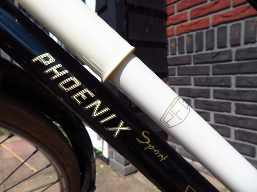 ik vind het een prachtige en vooral smaakvol uitgevoerde fiets. waar in die jaren veel werd geëxperimenteerd met (felle) kleuren(combinaties) en opvallende, soms schreeuwerige transfers, is deze phoenix wat dat betreft mooi uitgebalanceerd: traditioneel zwart (met bescheiden , doch mooie biezen en transfers) afgewisseld met lichte kleuraccenten (wit (op sierkettingkast, een tweekleurig (zwart/wit) lemet-zadel en witte ventieldopjes) en grijs (snelbinder, spatlap en stuurbeschermer).