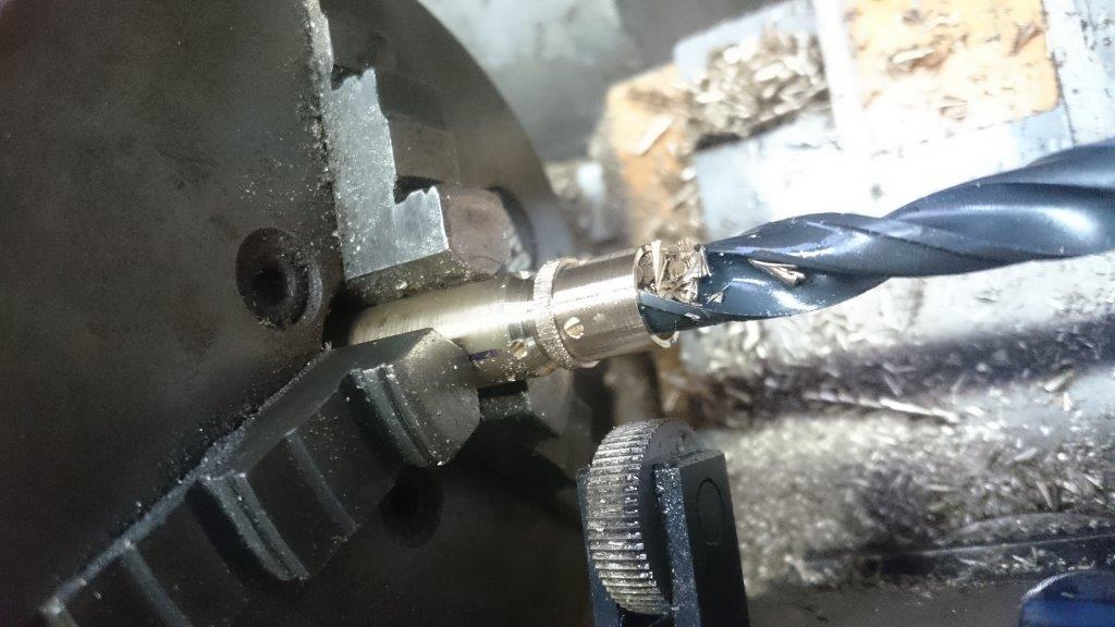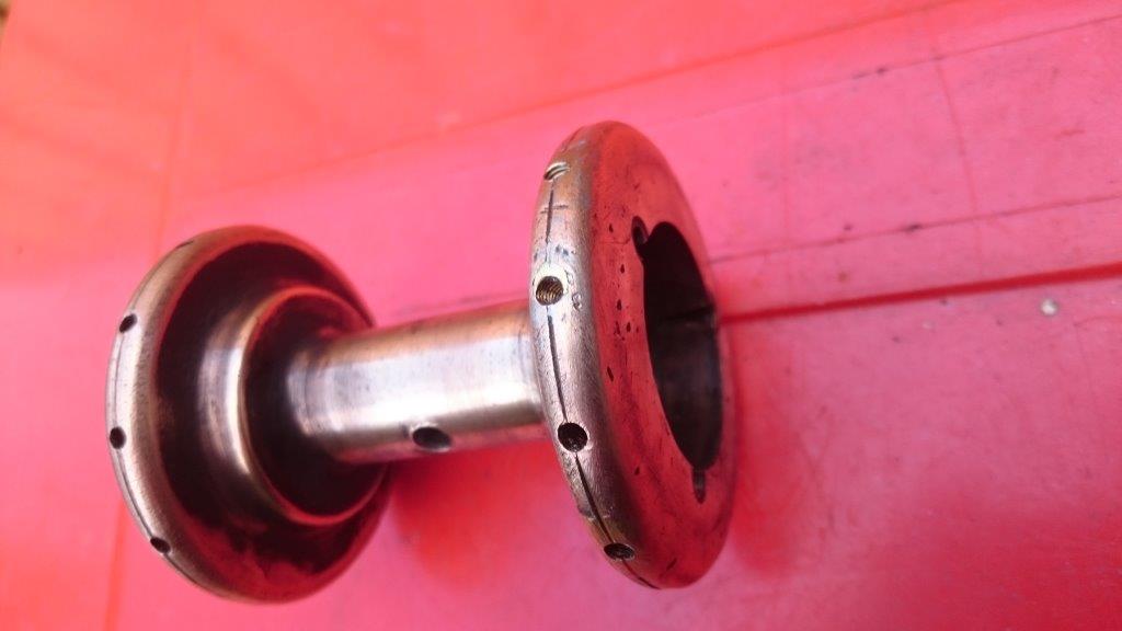 De asjes die door de gaten lopen waren ovaal. Ook daar heb ik iets van een halve millimeter afgedraaid om ze weer rond te krijgen. Zo hou je een bus over van ca 1 mm wanddikte. Om die van binnen perfect recht te krijgen heb ik hem nog opgezuiverd, met enkel boren krijg ik toch altijd een heel licht conisch gat, aan de ene kant 1-10e of 2/10e mm ruimer dan aan de andere kant.