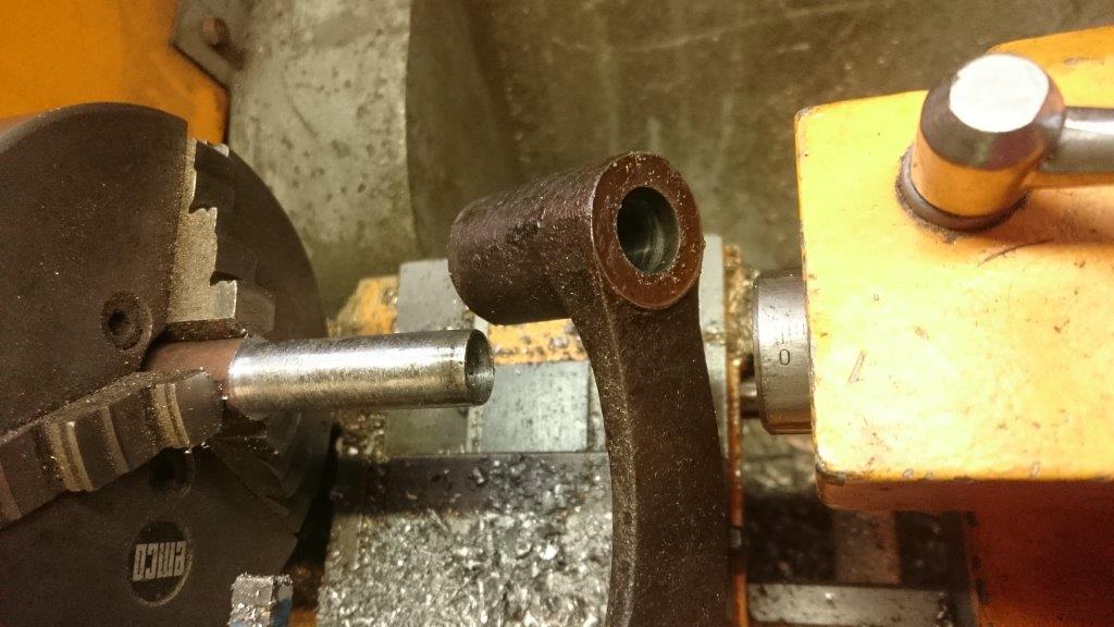 Dus: het bestaande gat een millimeter of anderhalf uitboren, daar een op maat gedraaide bus in persen. Om die lekker te laten klemmen heb ik de arm verhit. Daarna past de bus er precies in. Na afkoelen zit de bus moervast. Het fijne is dat je die bus desnoods later nog eens kunt vervangen.
