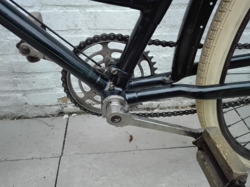 Een beetje een noodsprong die niet heel slecht is uitgevallen. Mogelijk pak ik het later nog eens op. De kettingkast heeft geen drukknopen omdat die op de oude fotos ook niet te zien zijn. In plaats daarvan zijn er dubbele vingerplaten geplaatst zoals wel vaker onder bij het achterwiel is toegepast.