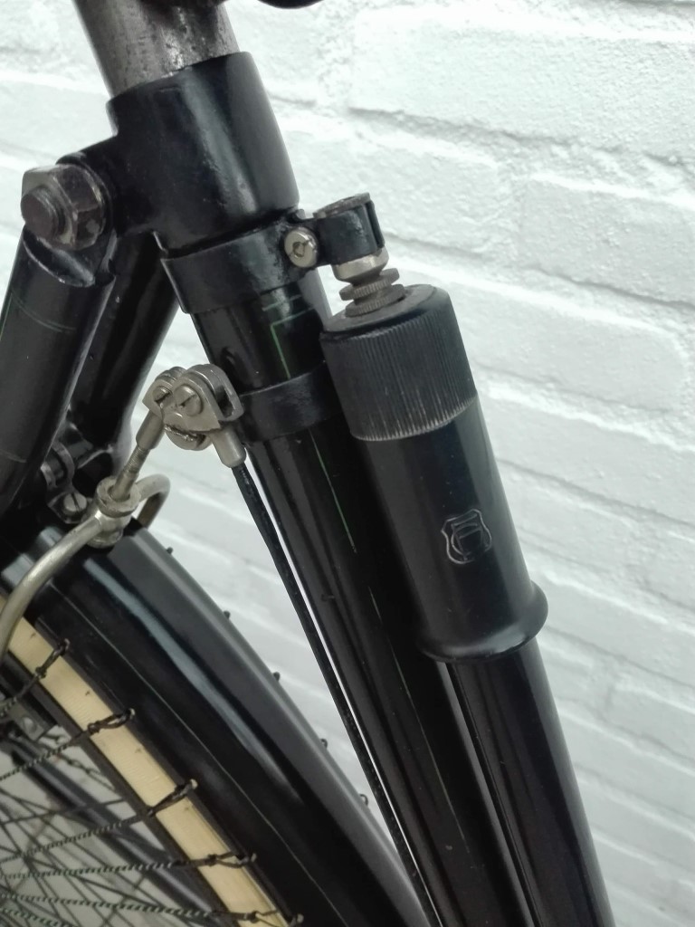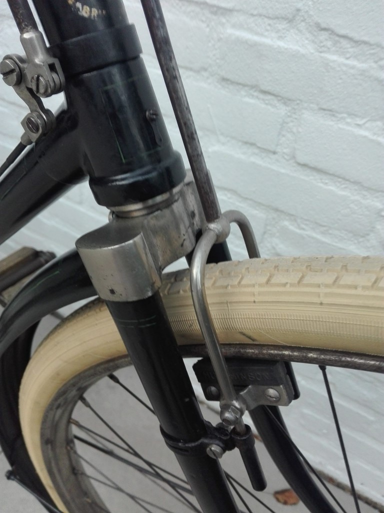 Wat ik ook heb aangepast is de lengte van de remstangen van het balhoofd. Op alle beschikbare fotos zijn die veel langer dan tot nu op deze fiets zat gemonteerd. Dat is denk ik fout gegaan bij revisie van de fiets in de fabriek destijds. Nu zijn ze weer mooi op lengte. Ook de remblokken waren vervangen door iets van een ander merk. Er horen vernikkelde open remschoenhouders op. Voor heb ik gedaan en achter moet nog. De latere fietsen hebben zwarte remschoenhouders met vernikkelde asjes en schroeven.