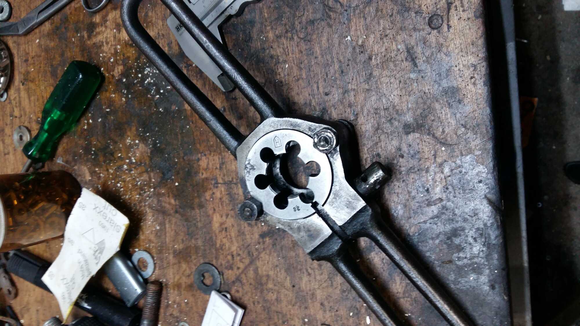Ik trap af met deze vorkdraadsnijder met een snijplaat voor 1" x 26 TPI, die men vroeger voor Raleigh (en misschien wat aanverwante merken) voorvorken gebruikte.