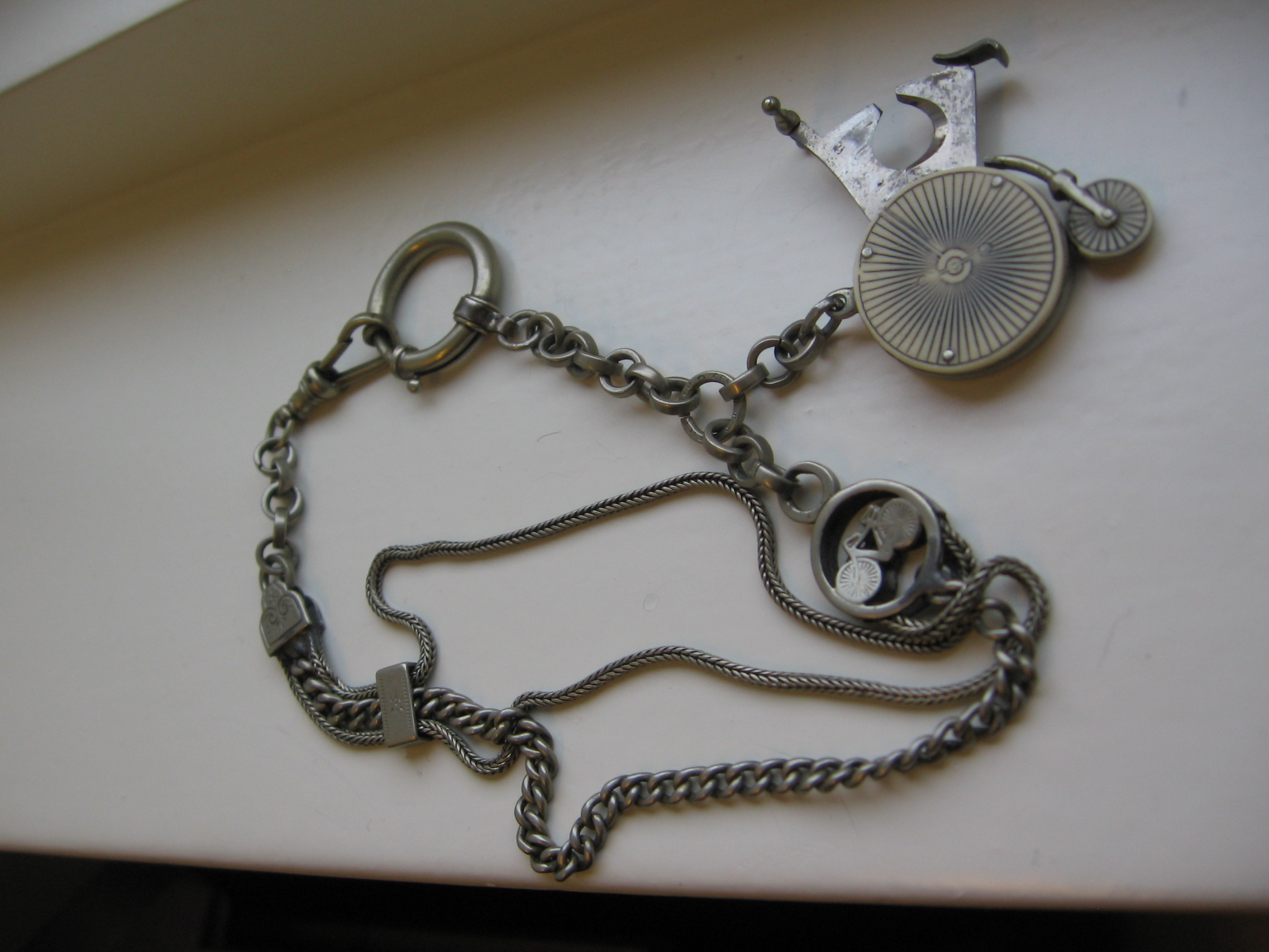 toch vind ik het geen geheel ,alleen al om de drie verschillende schakels van de kettinkjes en lijkt het me zeer onhandig om nog een extra zwaar ding zoals een sigarenknipper aan je[zak]horlogeketting te hebben hangen + nog een extra bedel met dat fietsje