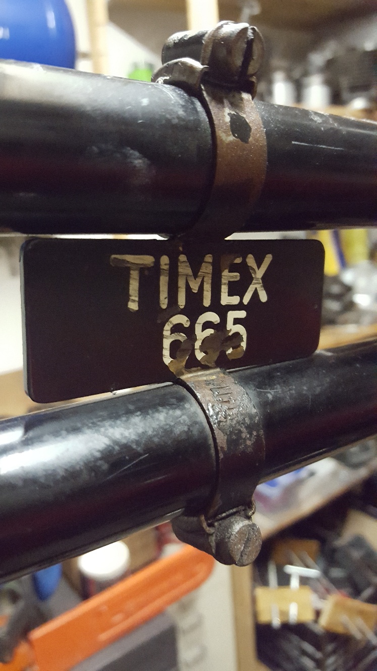 Op mijn transportfiets zit een plaatje met de tekst TIMEX 665