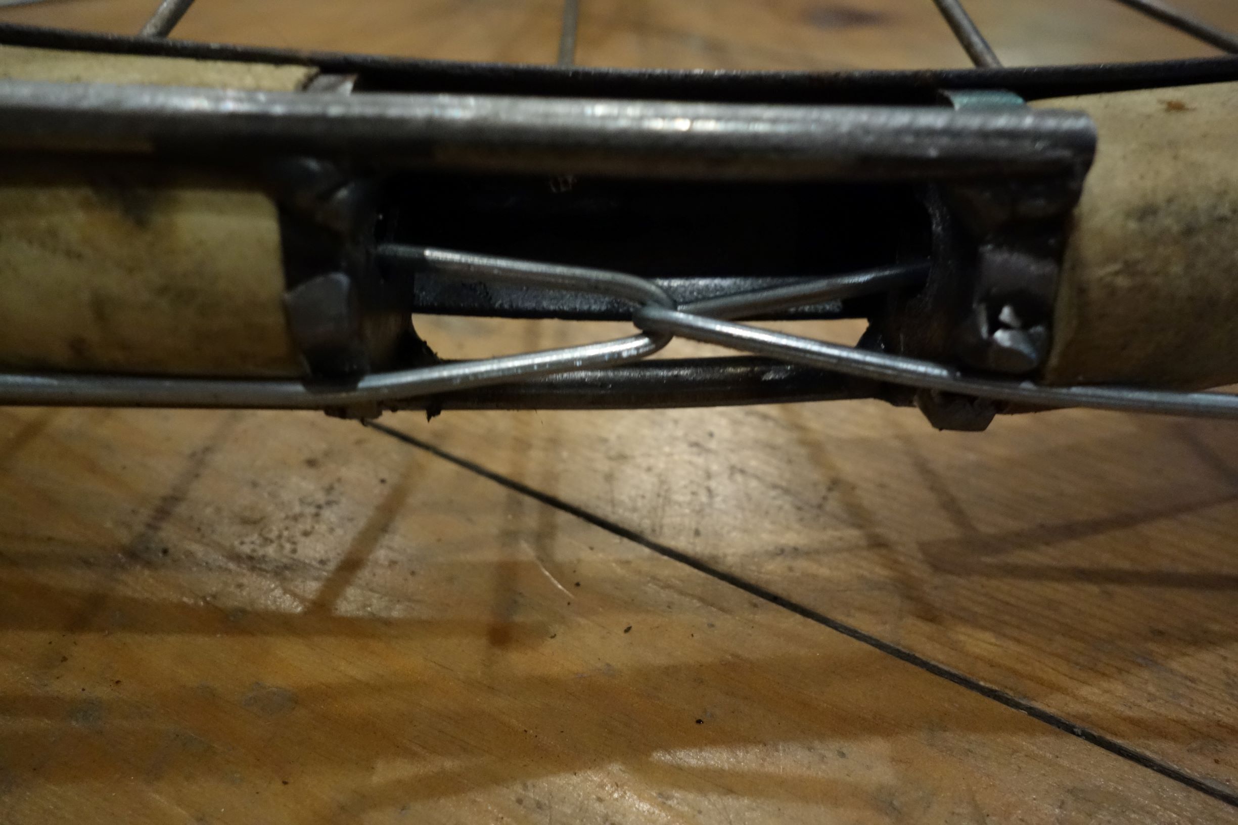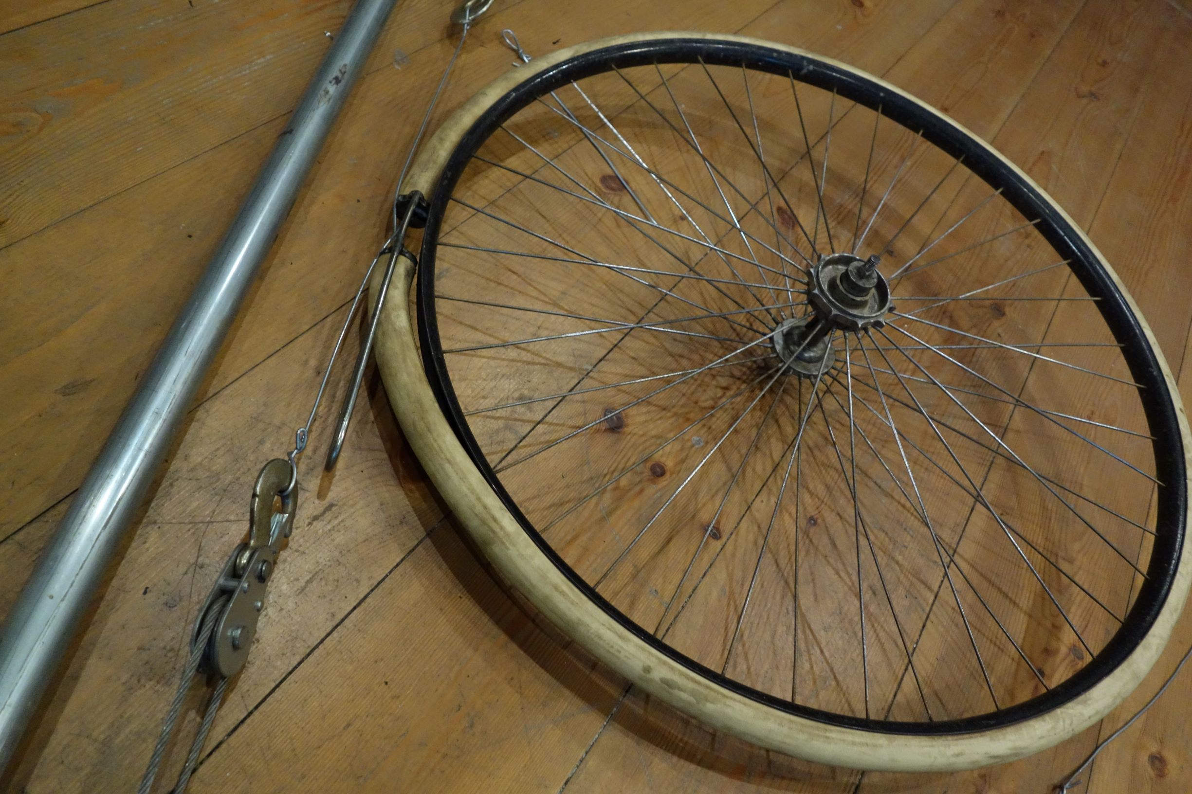 Ik heb een beetje een rommelige manier van monteren. Je zou een stuk muur kunnen nemen en een werkbank waarop het wiel ligt. Ik gebruik een buis als muur en twee hand lieren waaraan de staaldraad aan bevestigd is. Aan het uiteinde van de lier zit ook weer een haak die dus achter in de buis haakt. Een lier is voldoende als je het andere uiteinde van de staaldraad aan de buis (of de muur) zou bevestigen.