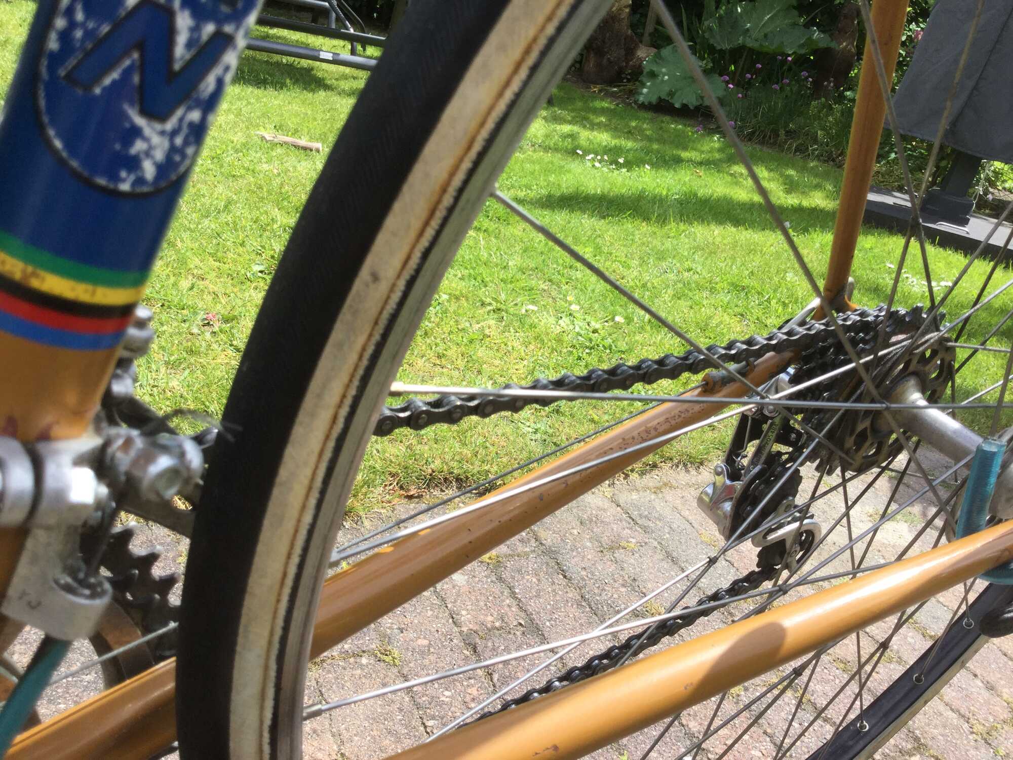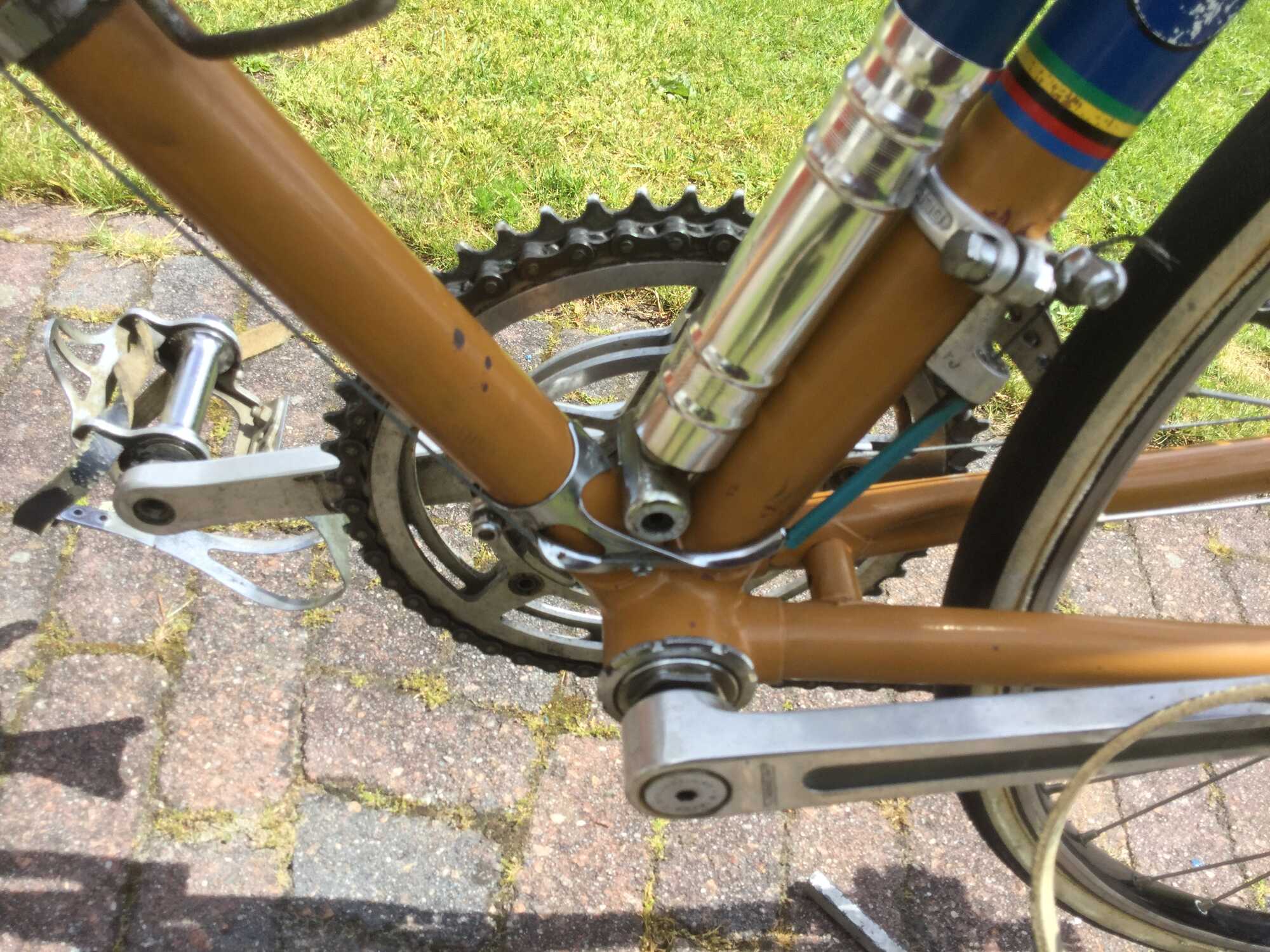 En daarom zijn het ook allemaal onderdelen uit heel verschillende bouwjaren? In de tijd dat er op deze fiets gekoerst werd. deed niemand moeite om de boel 'origineel' te houden. Dus als er iets versleten was ging er wat nieuws op. Of als je had gespaard voor een upgrade. Zieleman zelf deed ook niet moeilijk bij een grote beurt om van alles door elkaar op een fiets te schroeven
