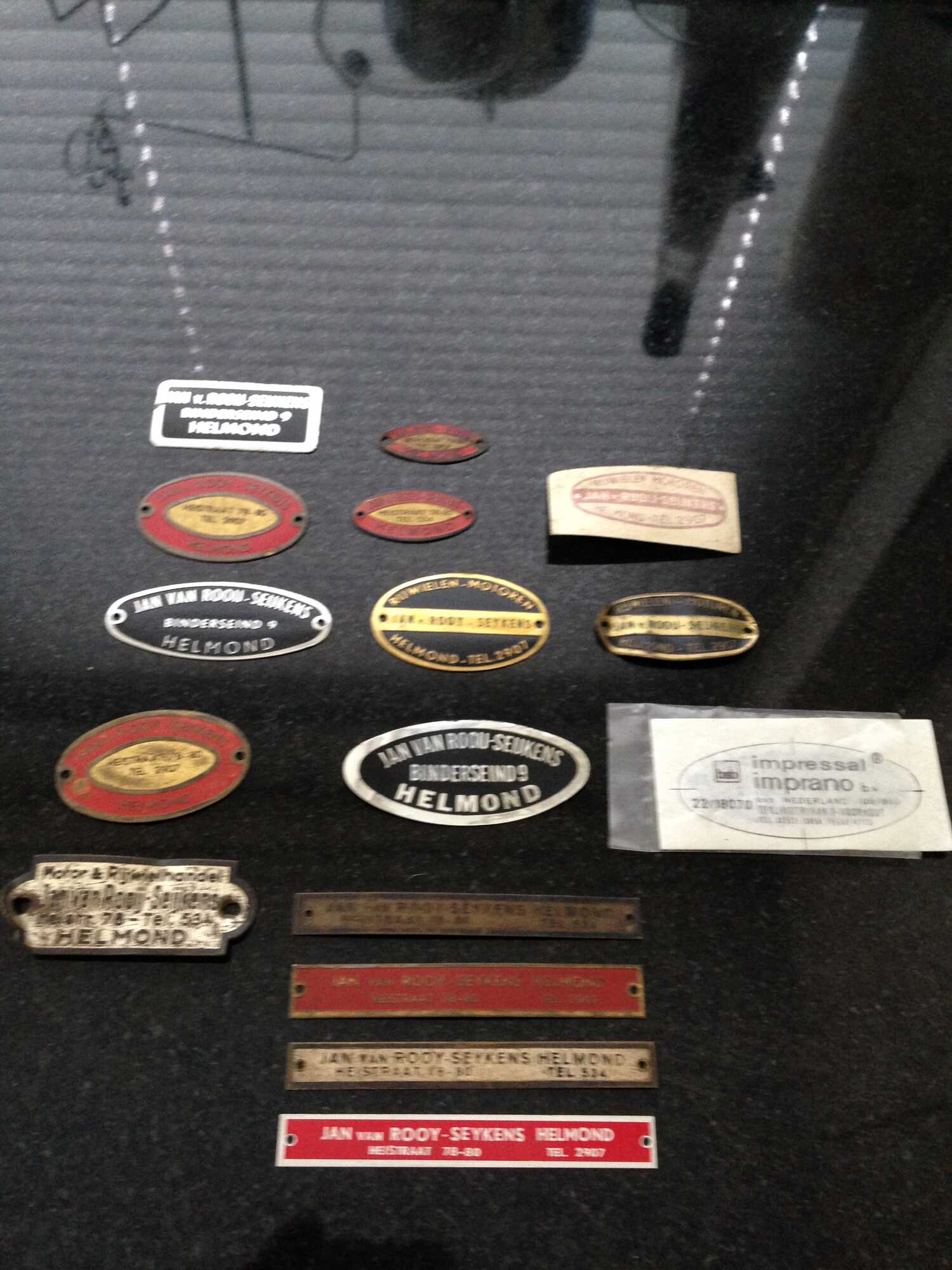 Tijdens dit bezoek heb ik een uitgebreide uitleg gekregen over de geschiedenis en het reilen en zeilen in de fietsenzaak. Leuk was het om te horen dat de boor waarmee het plaatje op de fiets was geschroefd nog aanwezig was en dat na een pijnlijk ongelukje waarbij Dhr. Van Rooij het boortje door zijn vinger had gekregen men was overgestapt op stickers. Een complete verzameling van deze verschillende plaatjes kwam vervolgens ook nog boven water met de bijbehorende klinknageltjes.