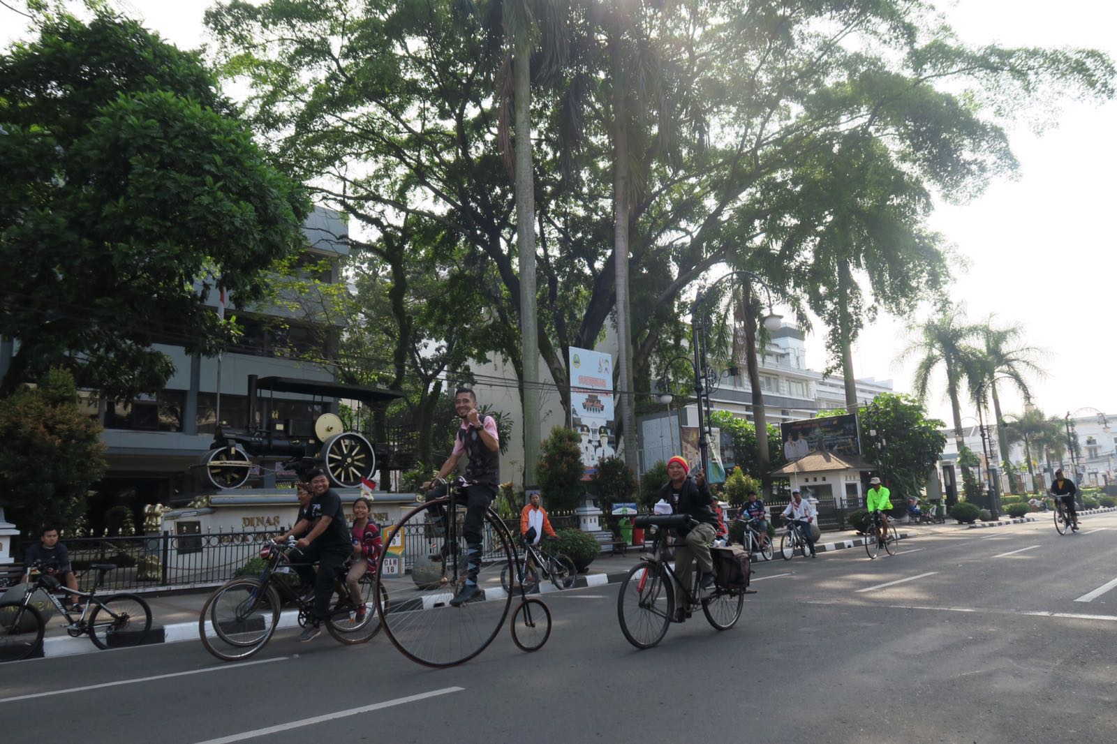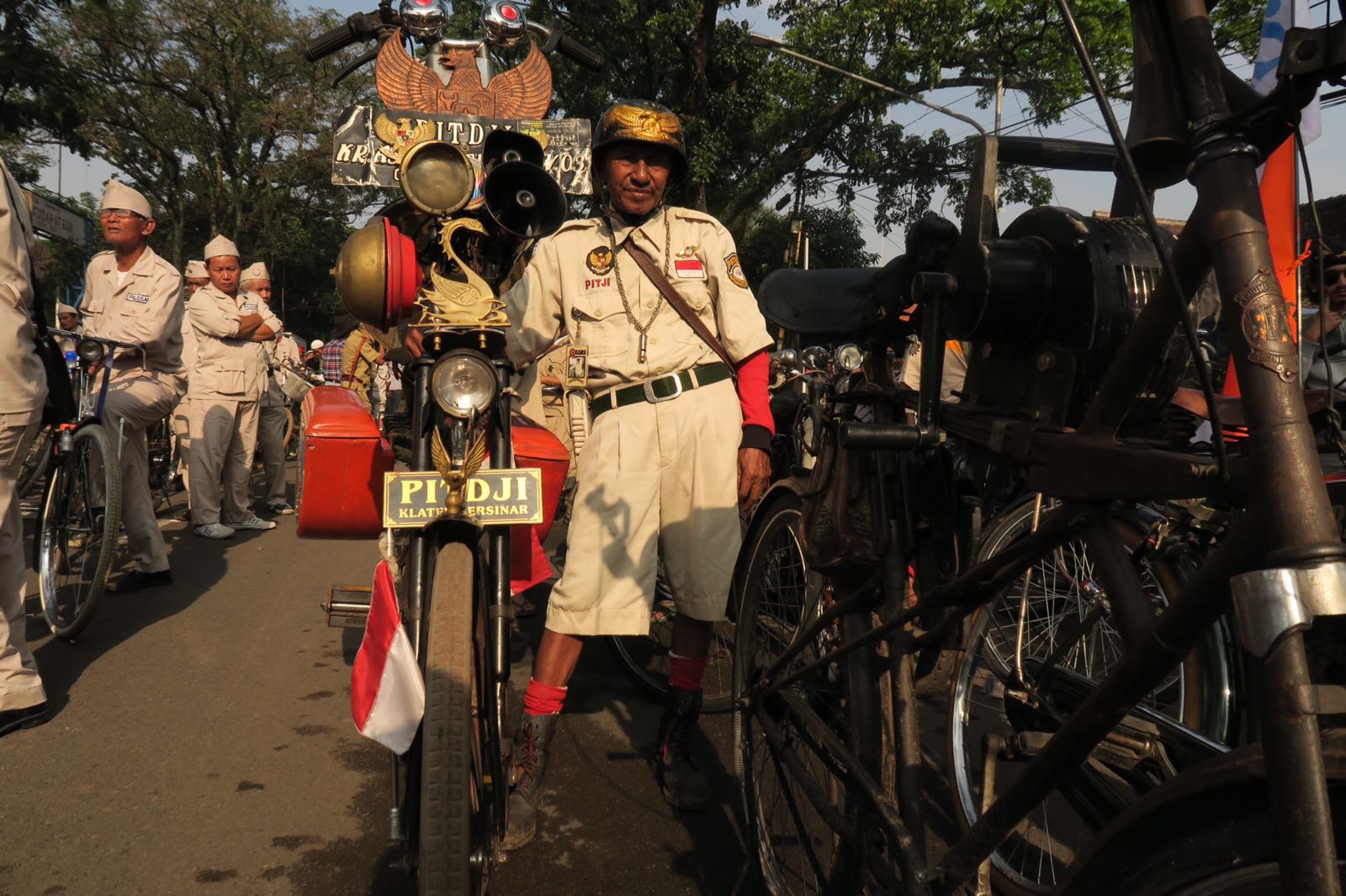 De volgende dag begon het evenement en in de middag was de eerste ceremonie gepland. We werden door Firman netjes opgehaald bij het hotel en naar het evenement gereden. Aangekomen bij het evenement werden we begroet door een aantal Indonesiërs die we in Nederland al eens hadden ontmoet. Jen was al eens eerder in Indonesië geweest en ook Jos kende natuurlijk al de nodige mensen daar. Als eerste werden we begeleid naar de marktlocatie waar allerhande oude fiets spullen werden verhandeld. De markt bood allerlei fiets gerelateerde zaken (pedalen, bellen, zadels) en veel hebbedingetjes (tasjes, broekriemen, sleutelhangers, reclameborden), met o.a. het Fongers-logo er op. Er waren ook wel wat originele (Fongers) onderdelen, zoals dynamo's, achterlichten, sturen, etc., maar dan wel tegen tóp prijzen.