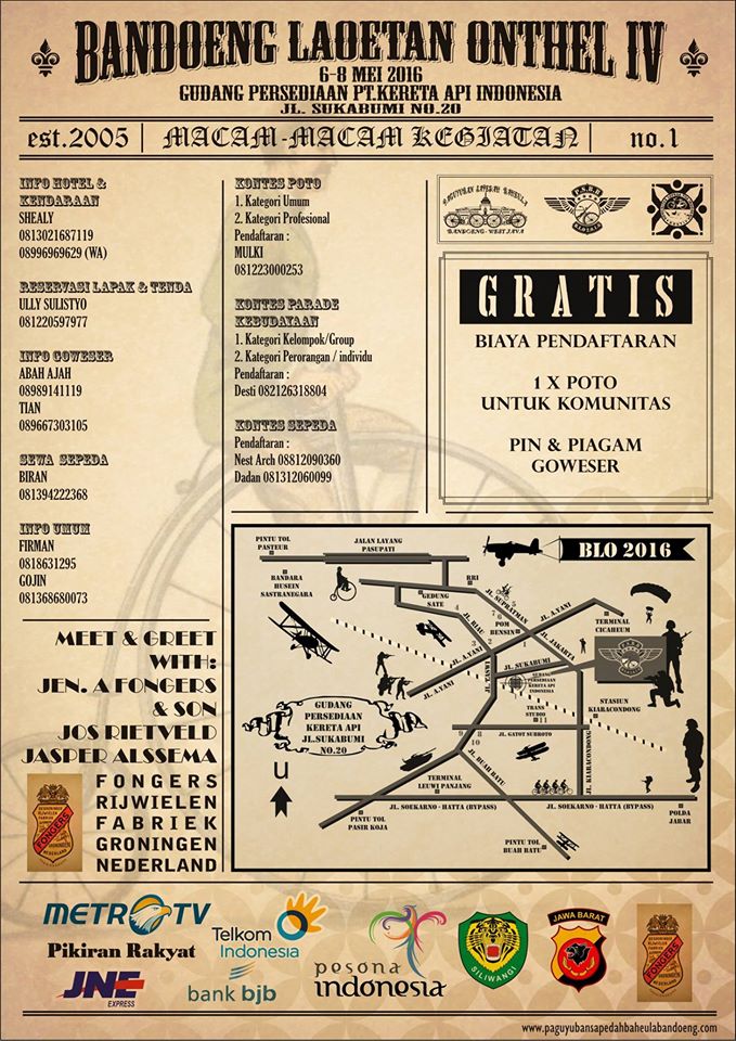 Het is eind 2015 wanneer ik van Jos begrijp dat er in mei 2016 een groot ‘oude fiets’ evenement gehouden zal worden in Indonesië onder de naam; Bandung Lautan Onthel (‘Bandung zee van oude fietsen’). Onderstaand de aankonding waar ook onze namen op te vinden zijn.