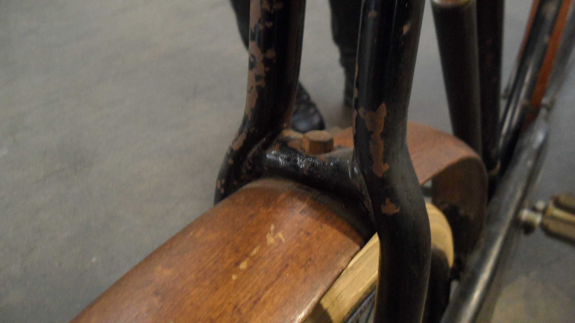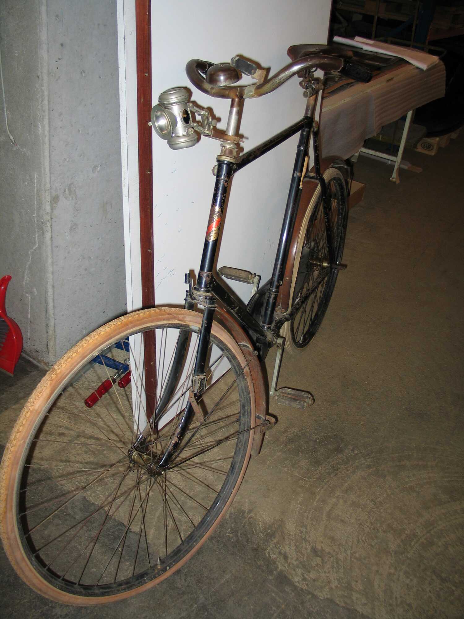 De fiets heeft wel degelijk oplopende achterpatten. Door de platte spatborden lijkt het alsof de wielen klein zijn, maar ze zijn gewoon 28 inch (in 1900 werden nog 30 inch voorwielen gemonteerd; van deze oude fiets zijn geen specificaties in het archief terug te vinden). Bijgaand nog wat foto's.