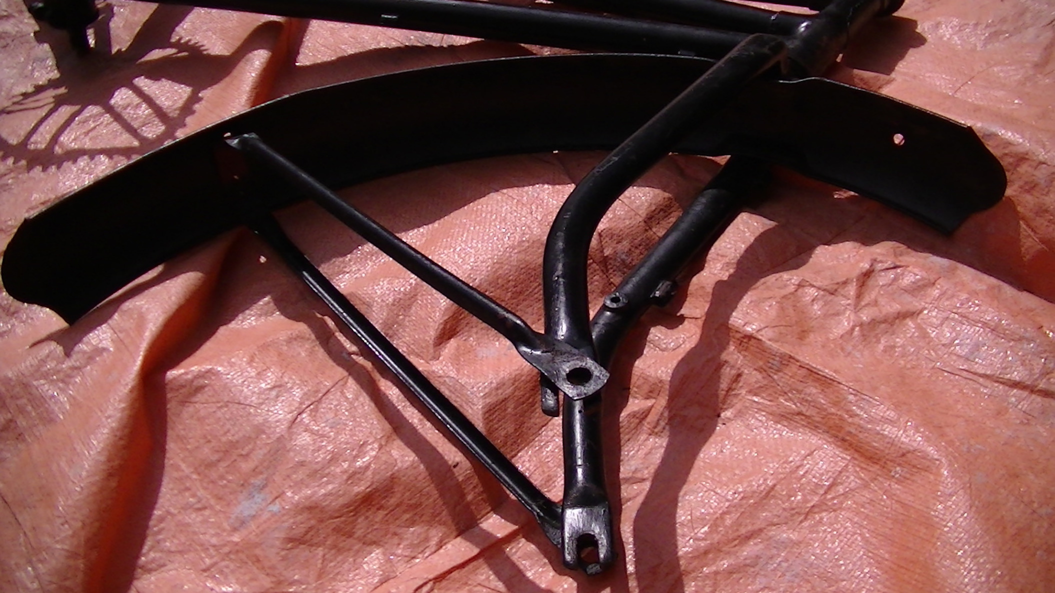 Na uren gegoogled te hebben kom ik er niet uit welke naaf het geweest kan zijn. Sturmey Archer leek een momentarm te hebben die lang genoeg is, maar heeft geen gaatje in de momentarm. F&S heeft dat wel, maar daarvan lijkt de arm weer korter. Bayliss Wiley lijkt een kandidaat, maar daar kan ik geen maten van vinden. De afstand tussen de vorkpoten van mijn fiets bedraagt voor 9,7cm en achter 12cm, de gleuf in de vork voor beide assen is 9,8mm. Achter moet ook een trommelrem zijn geweest want er zitten ook klemmetjes voor een bowdenkabel aan de linkerkant van de vork. Er past zowel voor als achter geen bout M10 in de gleuf voor de as in de vork.