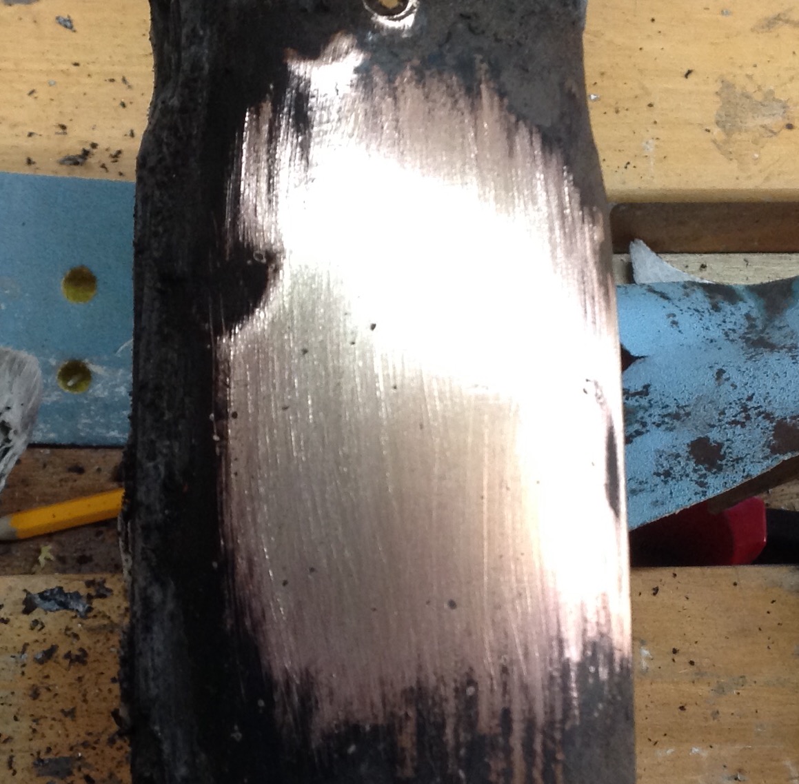 Op de onderste foto waar de link naar verwijst is duidelijk te zien dat ik ook aan het poetsen ben geweest. Dat was met Scotch Brite. De plek is inmiddels bijna niet meer te zien omdat het koper weer geoxideerd is.