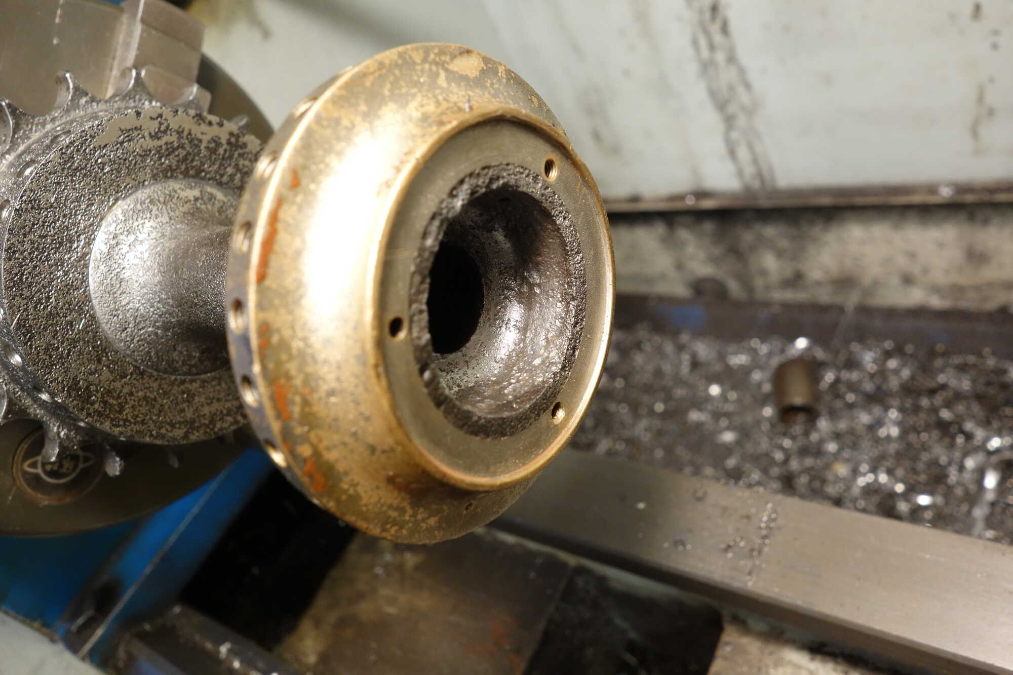 De naaf heb ik ingespannen op een as van bijna 16 mm. In het olievulgat zit tijdelijk een inbus boutje M6 om meedraaien te voorkomen.