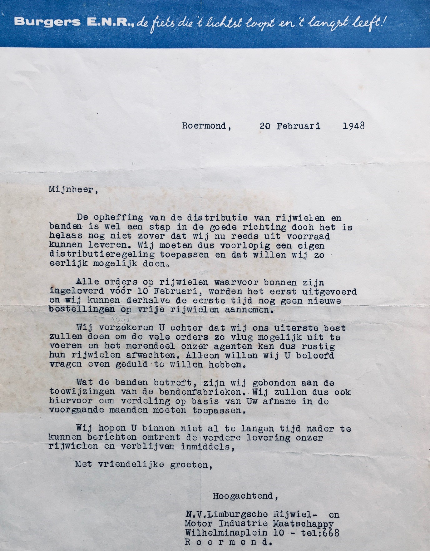 Hierbij nog een document over de opheffing van de distributie van rijwielen en banden in 1948.