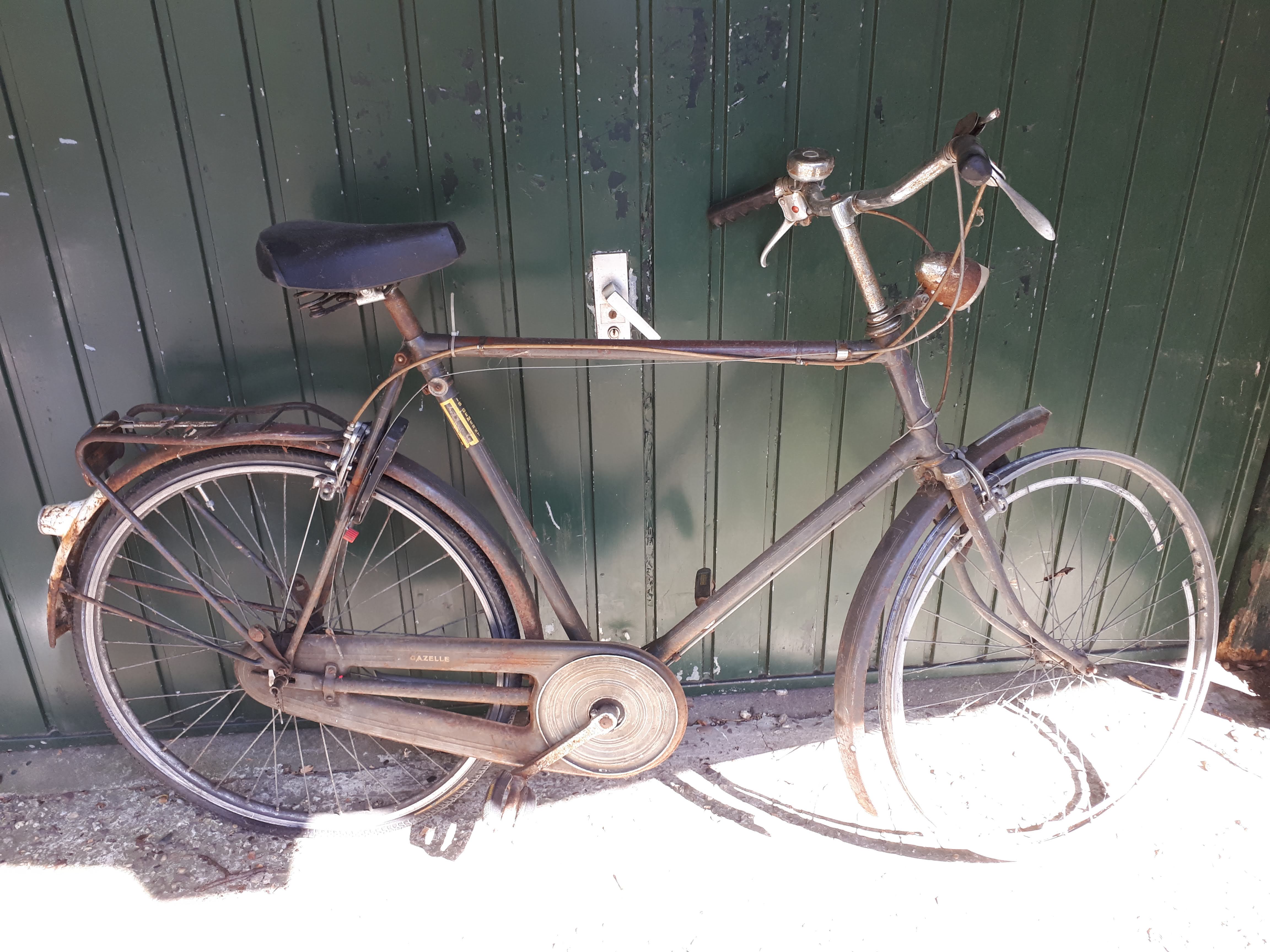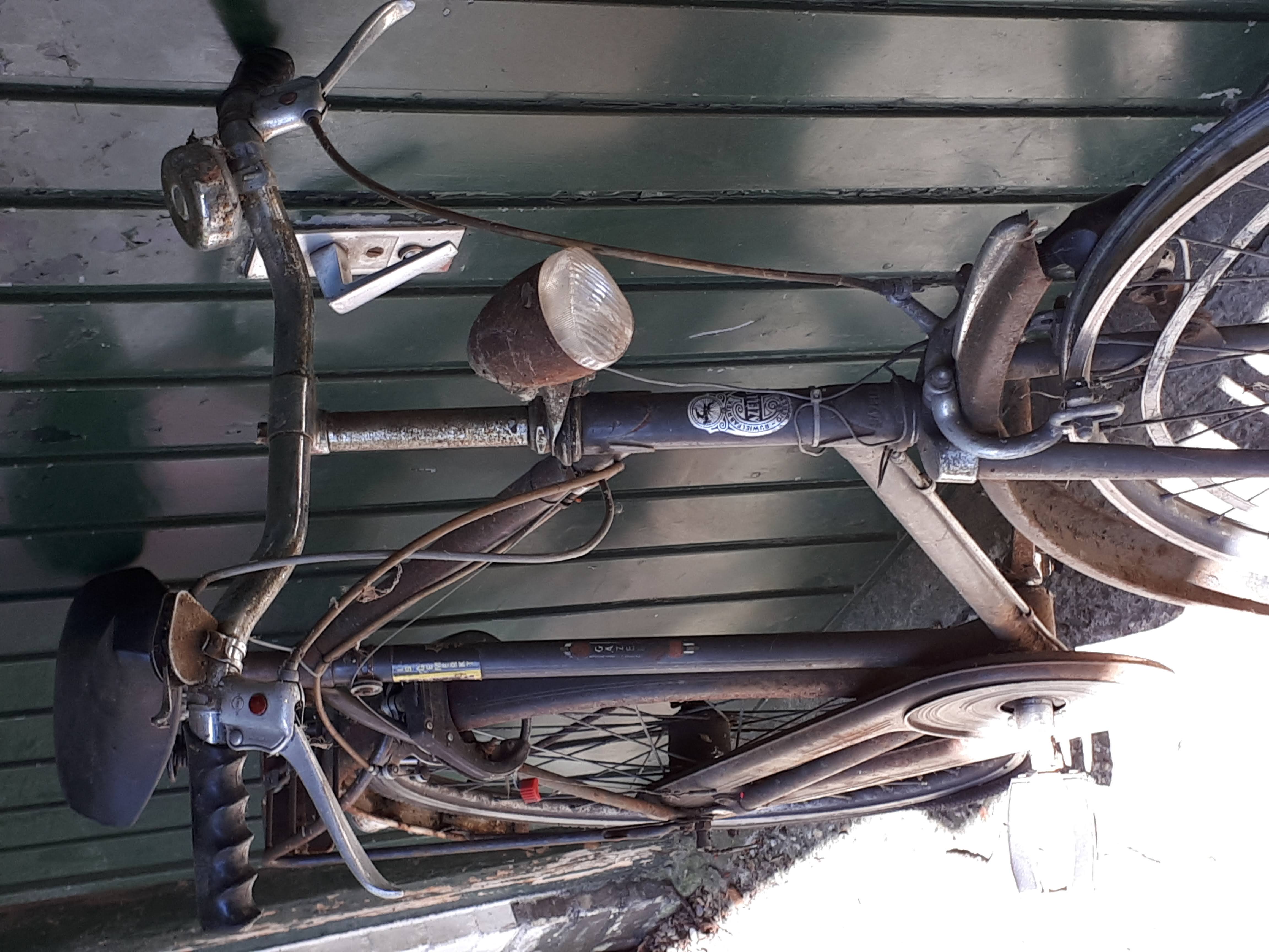 Beste mensen, de A-sport van mijn vader staat al jaren bij mij in de schuur om op te knappen. Hij is nog grotendeels origineel, met Gazelle stuur, SA versnelling en Weinmann velgremmen, en achterlicht met verklikkerglaasje, maar heeft te lijden gehad onder sneeuw en pekel en is zodoende op verschillende plekken verroest. Ik had 'm willen opknappen maar krijg 'm zelf nooit meer zo mooi met die biezen enzo.