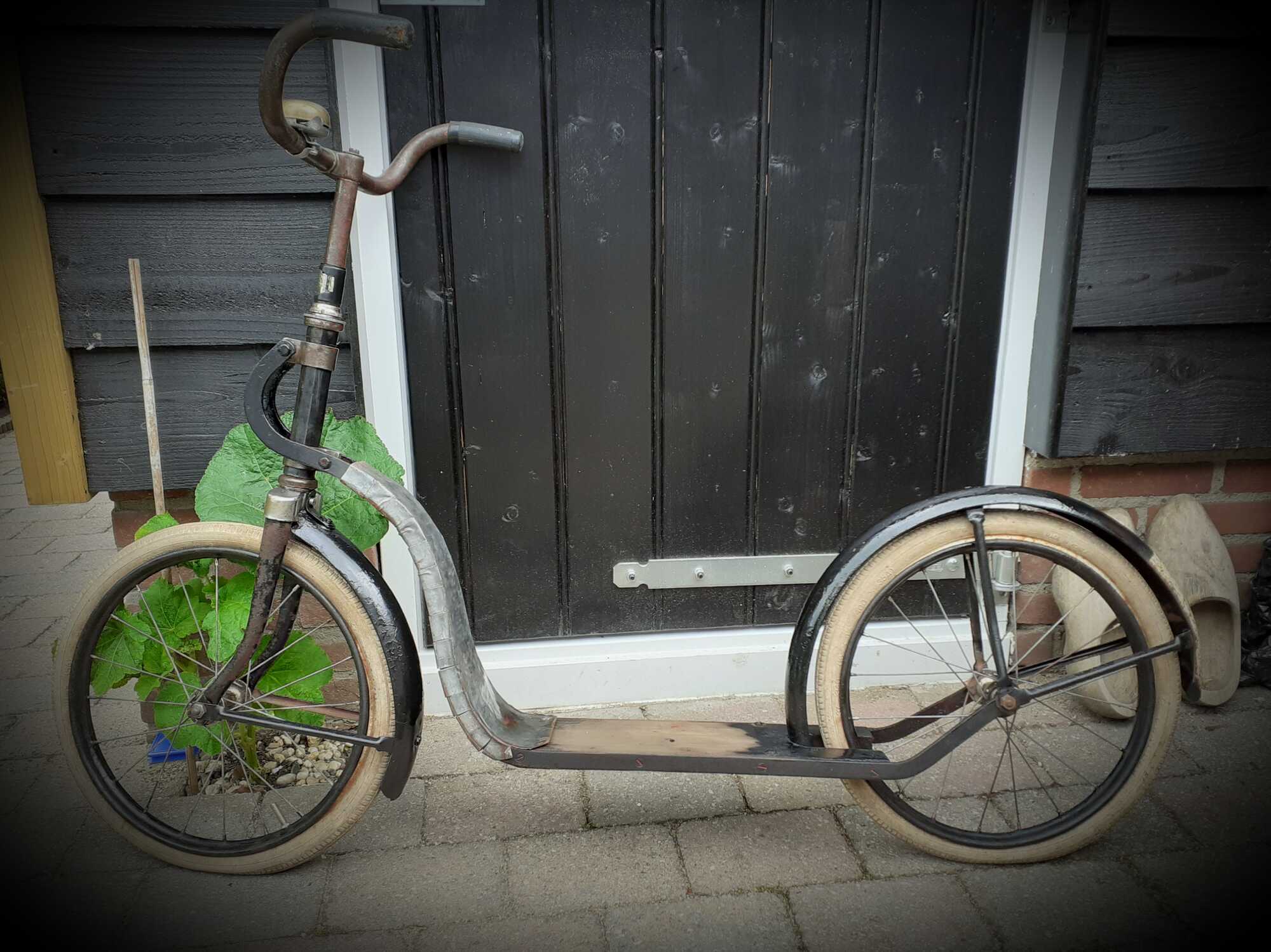 En in het houdertje om het stuur zit een rijwielbelastingplaatje van 1939/1940, dat is wel opmerkelijk. Volgens een artikel van de Stichting Fiets, waren kinderfietsen en driewielers vrijgesteld van deze belastingmaatregel. In de oorlog kon je wel van allerlei creatieve oplossingen tegenkomen om een fiets aan het rijden te houden - massieve banden, kleine stepwielen in een verlengde voorvork en deze step zou ook uit nood geboren kunnen zijn - maar dat was pas, lijkt me, toen na verloop van jaren allerlei onderdelen schaars werden, niet al in 1940.