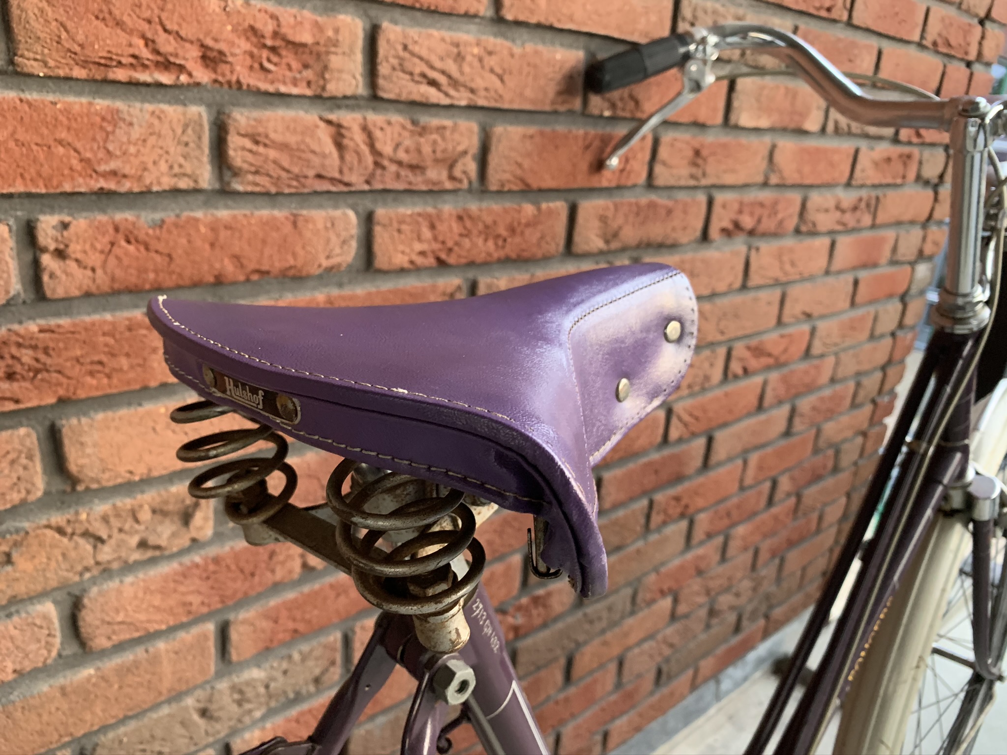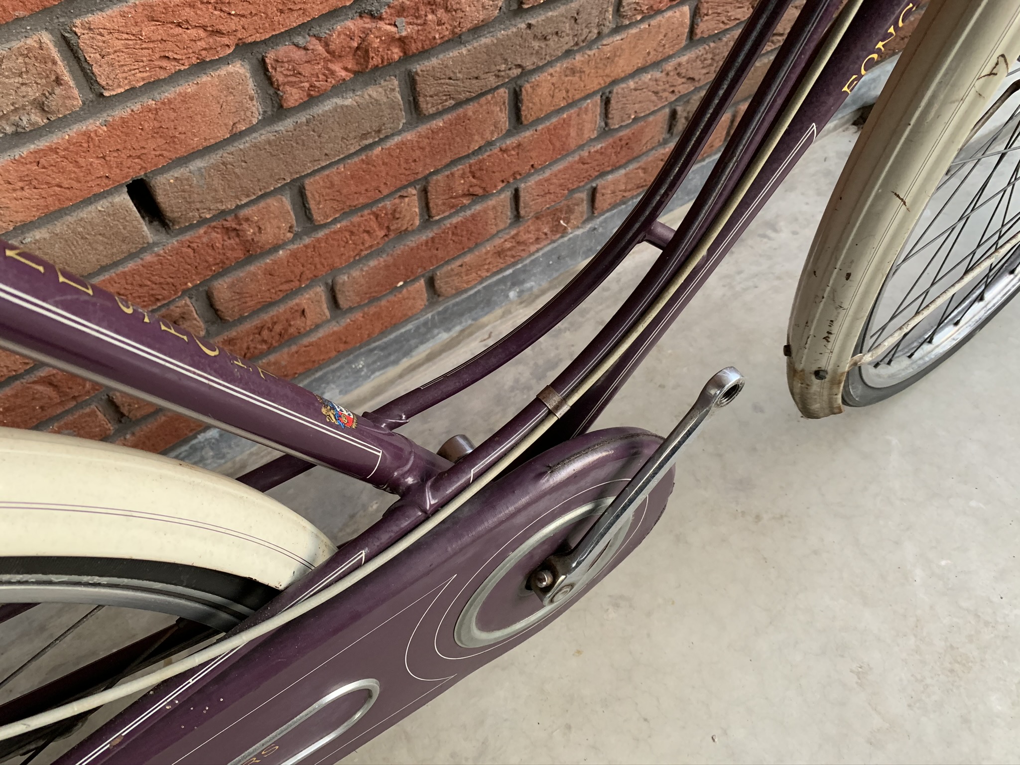 Het paarse frame lijkt haast wel nieuw en kent nauwelijks beschadigingen of roestplekjes. De spatborden en spatbordstangen wel iets meer.