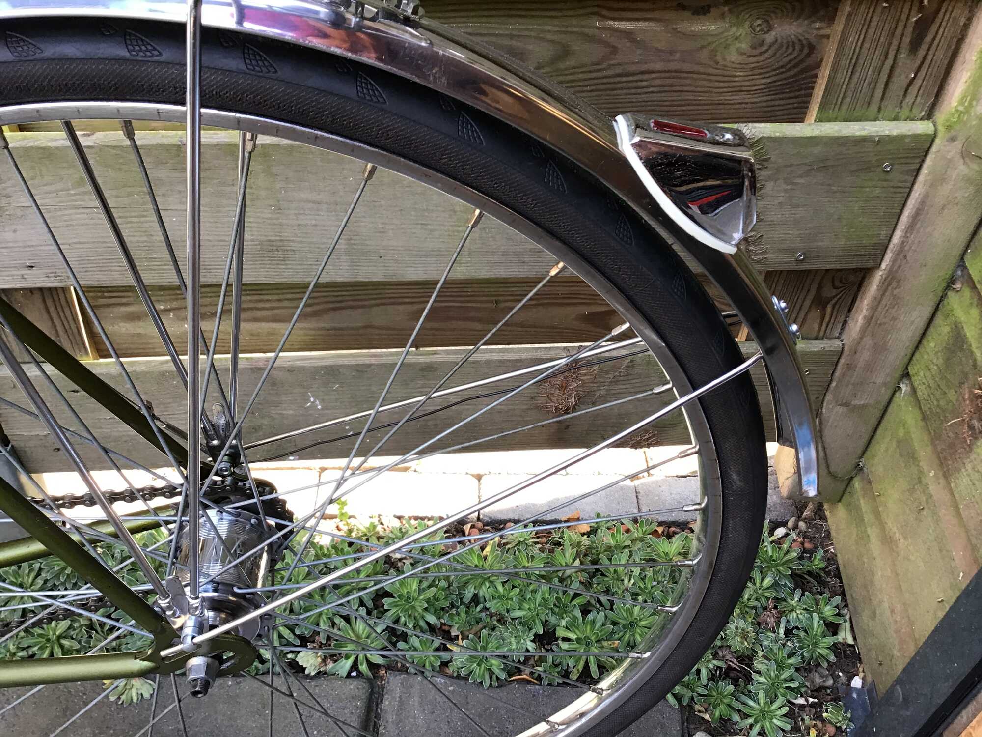 Weer een stap verder. Achterspatbord ontdaan van lak, vind ik mooier. Alle lagers vernieuwd, ingevet en versnellingsnaaf uit elkaar gehaald. Nieuwe kabels, zadelpen, zadel, banden, remblokken. Verlichting werkt weer.