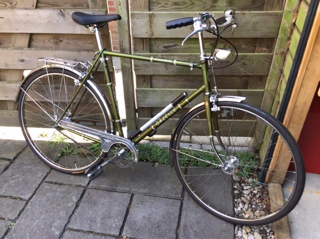 Weer een stap verder. Achterspatbord ontdaan van lak, vind ik mooier. Alle lagers vernieuwd, ingevet en versnellingsnaaf uit elkaar gehaald. Nieuwe kabels, zadelpen, zadel, banden, remblokken. Verlichting werkt weer.