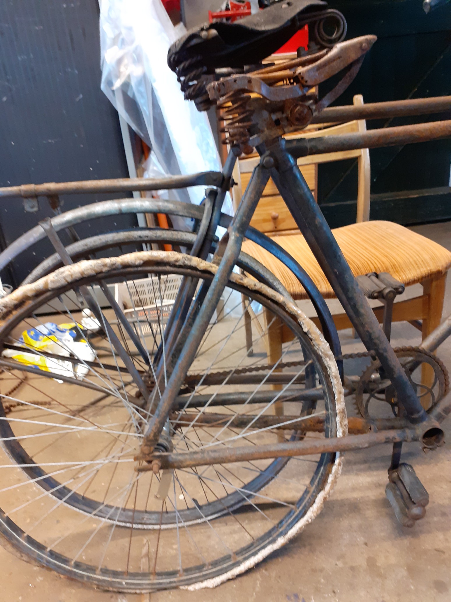Lijkt de bouw van het frame een beetje op dat van je herenfiets (vermoedelijk WKC) uit de Juncker fabriek? Zelfde lugs, mannetjes en bochten en denk je dat voor- en achterwiel echt bij elkaar horen?