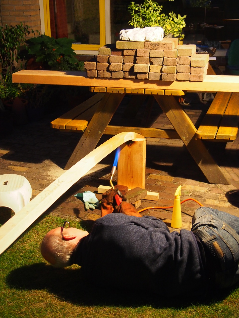 Wij hebben weleens een balk van 7x7 centimeter gebogen met water en vuur. En mooi dat dat gewoon in vorm bleef staan.... Zie foto!