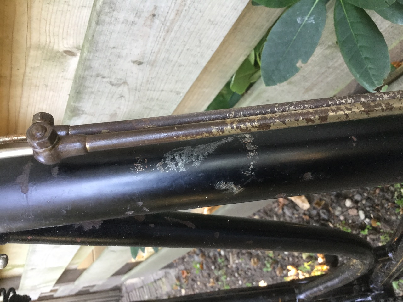 Deze fiets is vermoedelijk omstreeks 1930 opnieuw in de fabriek gemoffeld en de onderdelen vernikkeld. ik denk dat er toen vrijwel niets vervangen is behalve mogelijk de spatbord stangen.