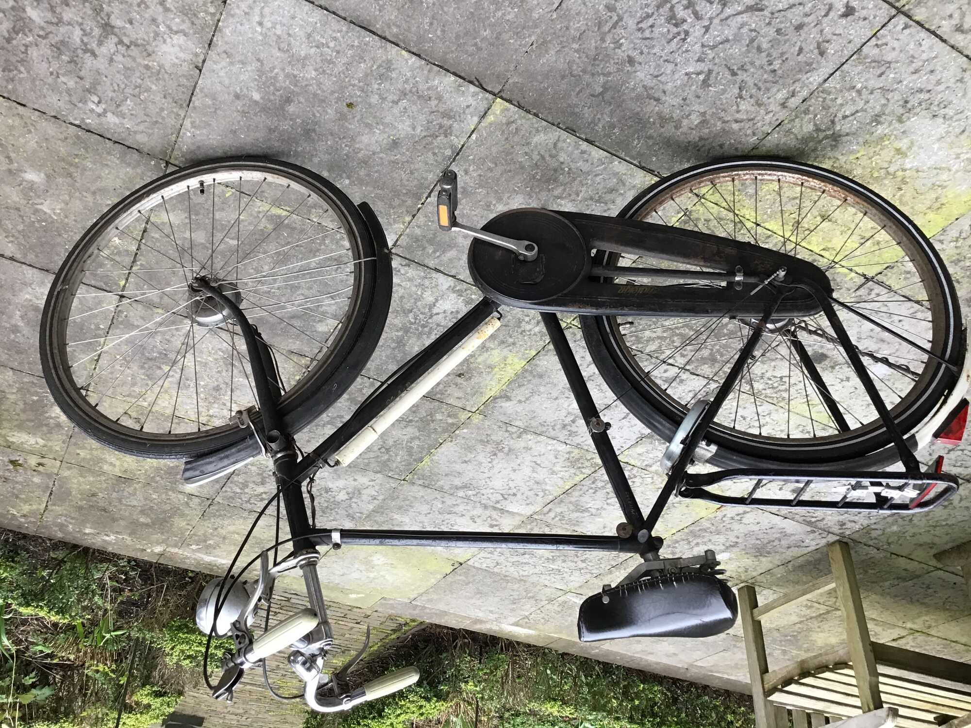 Mijn vader heeft deze fiets rond 1950 in Amsterdam gekocht. Hij was er heel netjes op, maar staat nu al 20 jaar bij ons in de garage en dat is niet goed. Alles doet het nog: handremmen, 3 versnellingen en naafdynamo. Originele gebruiksaanwijzing nog aanwezig.