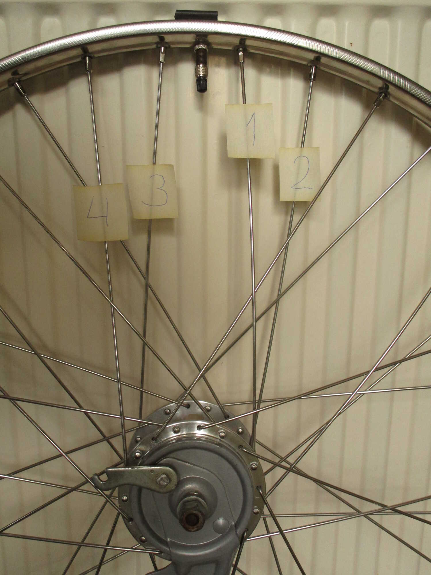 >Naschrift: het viel me opeens op dat bij sommige wielen de binnenste spaken links: achterover zitten en bij andere wielen: voorover. Dat ligt er aan, denk ik, aan welke kant van het ventiel je begint en in welke richting je vervolgens spaakt. Ik houd de velg voor me en begin achter het ventielgat.<