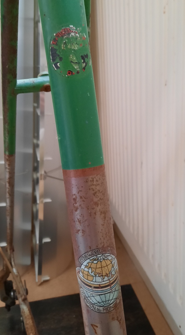 Het ronde dingetje is een Christoffel plaatje geweest. Wel een transfer welke bij verkoop op de fiets is aangebracht, deze is helaas niet meer voorhanden bij de familie Kint. De wereldbol eronder kan ik nog wel bij Kint krijgen.