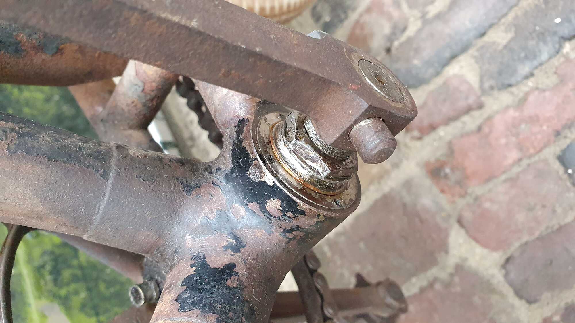 Zo achter de balhoofdbuis waar je dan een vleugelmoer verwacht. Dat is tamelijk veel toegepast bij Duitse fietsen tot nog ver in de 20e eeuw.