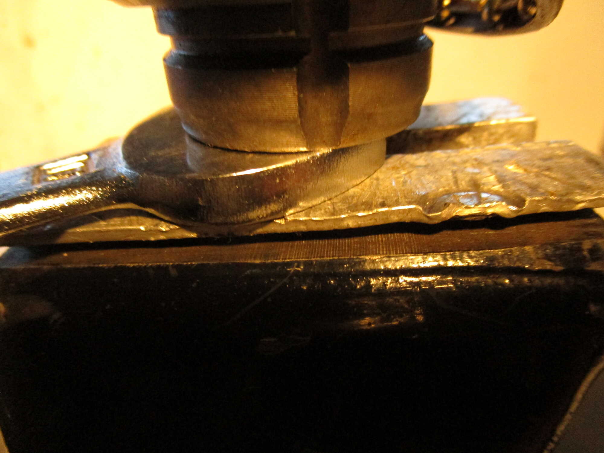 Met de andere kant van de as in de bankschroef geklemd, wordt het lastig demonteren, zo aan het bovenste uiteinde. Ook al omdat de steeksleutel twee erg smalle platte kanten op de conus aantreft, waardoor die er vrijwel zeker meerdere keren af zal schieten, wat voor beide geen behoud is.