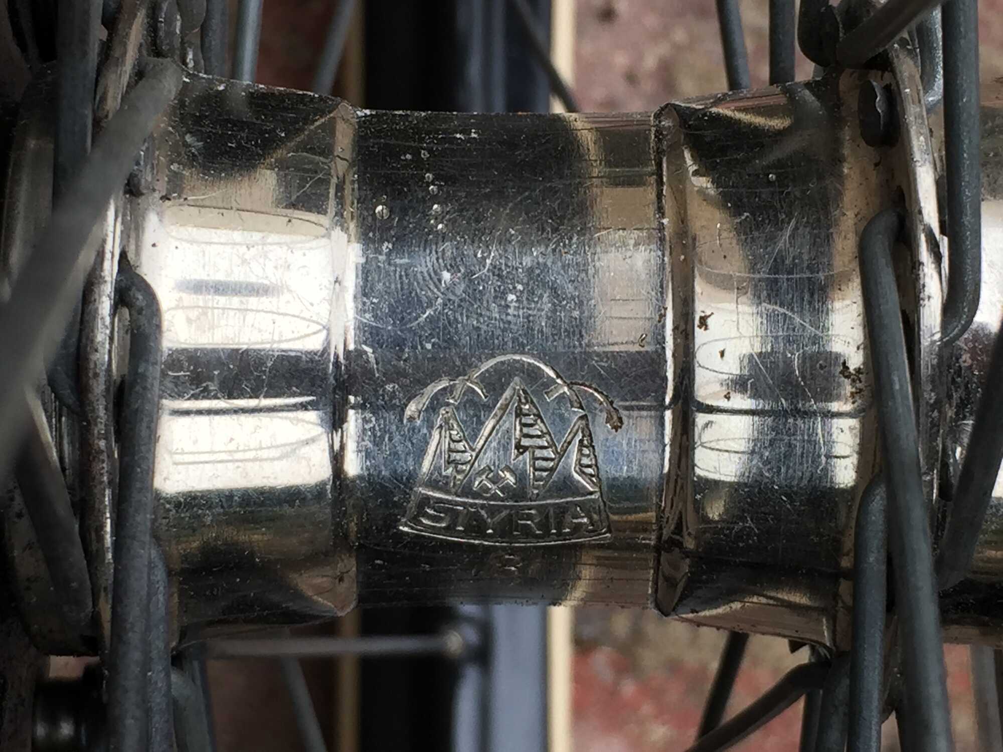 Omdat de fiets verder nog wel helemaal ‘als uit de fabriek’ leek heb ik er een achterwiel voor gespaakt met een zelfde velg als in het voorwiel en een naaf met een bouwjaar wat correspondeert met het framenummer.