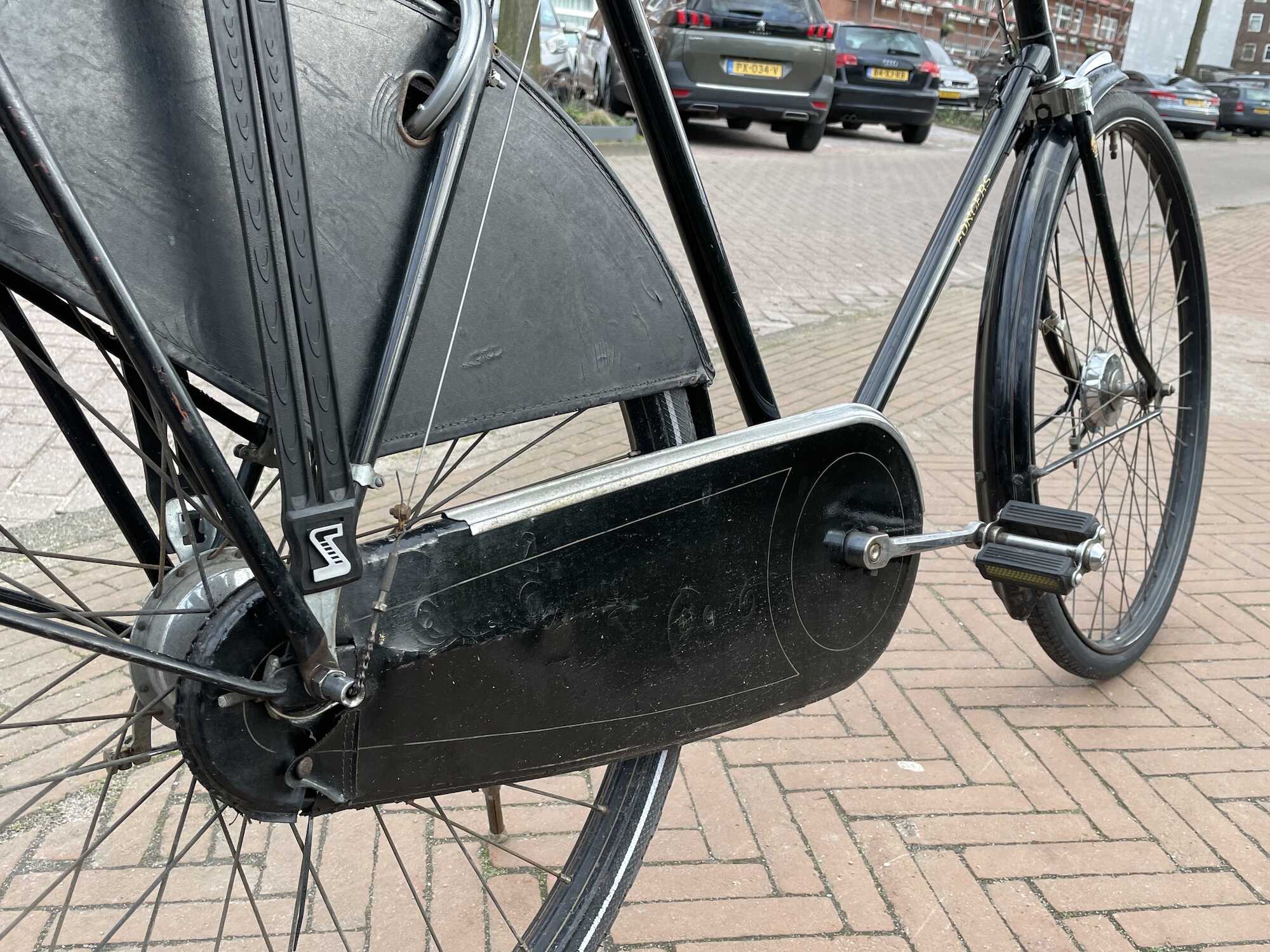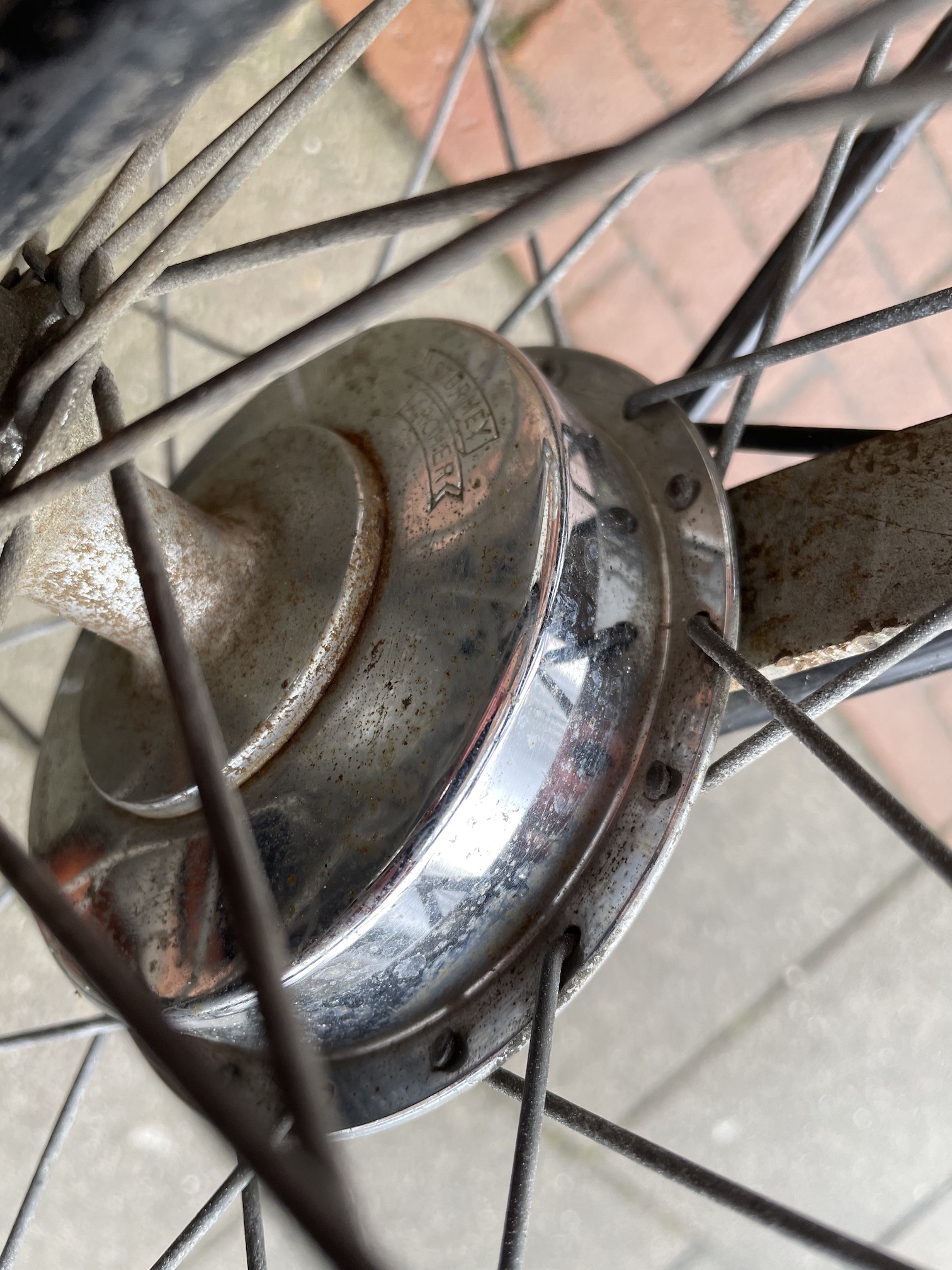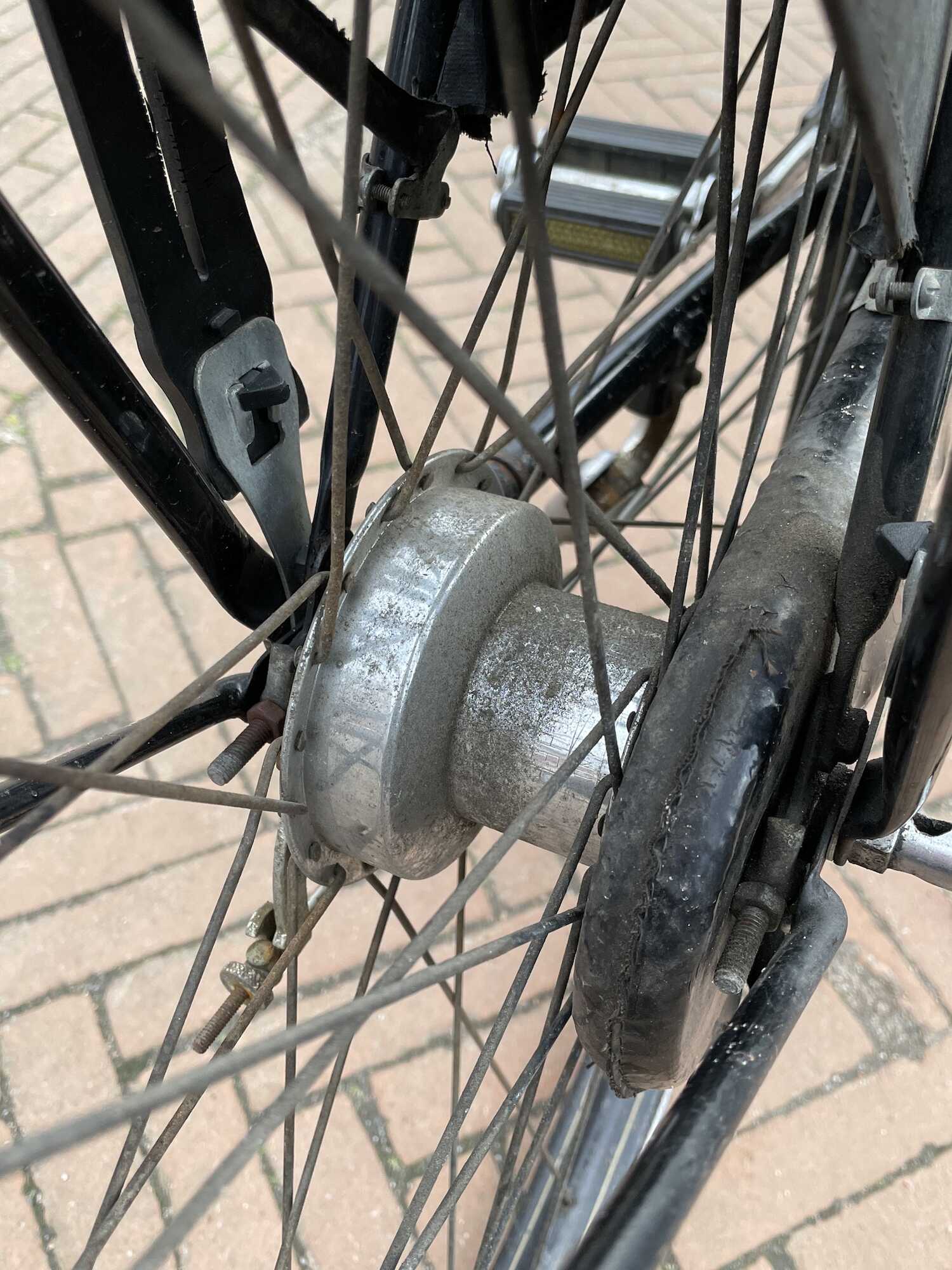 De naven zijn beide Sturmey Archer, met trommelremmen, 3 versnellingen. De velgen hebben beide een enkele bies. Banden: voorop een Vredestein Superior met volledig versleten ribbels voor de dynamo, dus die pakt niet lekker, en achter CST classic breaker, zal wel later erop gezet zijn.