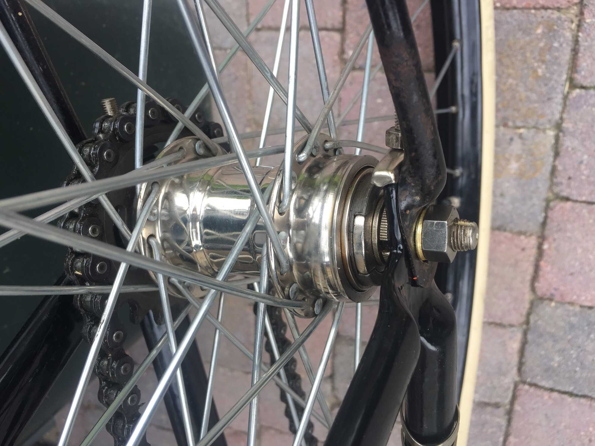 Maar omdat het kettingwiel 48 tanden en de maat 1/2 x 3/16 heeft wilde ik het toch handhaven. De linker crank is in ieder geval even lang. Alle klei en ander spul wat er door de jaren heen aan is blijven kleven is er vanaf gehakt. Daarna geschuurd en ‘prima gelakt’ met metaalbeschermingslak.