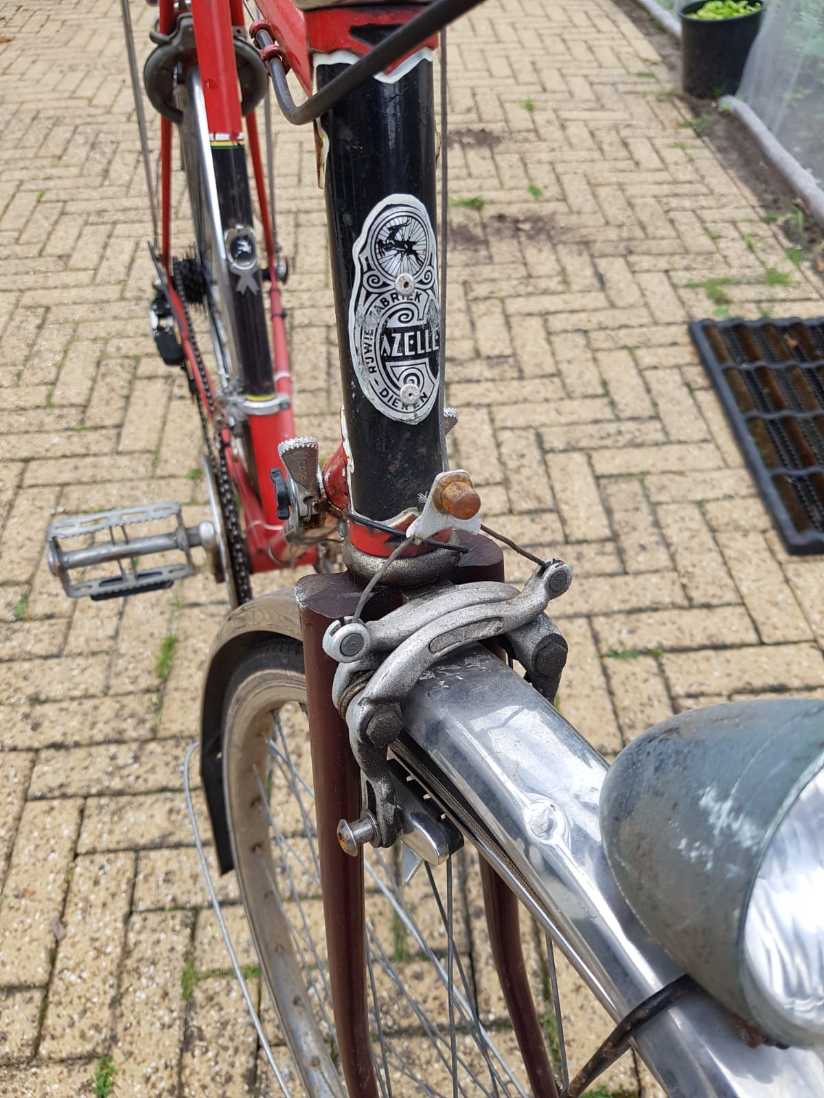 Mijn vader heeft zijn oude gazelle nog staan. Hij denkt dat hij ongeveer 40 jaar oud is. Ik heb er zelf in het verleden al op gefietst en dat ging goed. Echter heeft hij ondertussen wel wat opknapwerk nodig. Er is ooit een andere voorvork op geplaatst waardoor de remblokjes nu op de band remmen en niet meer op de velg.