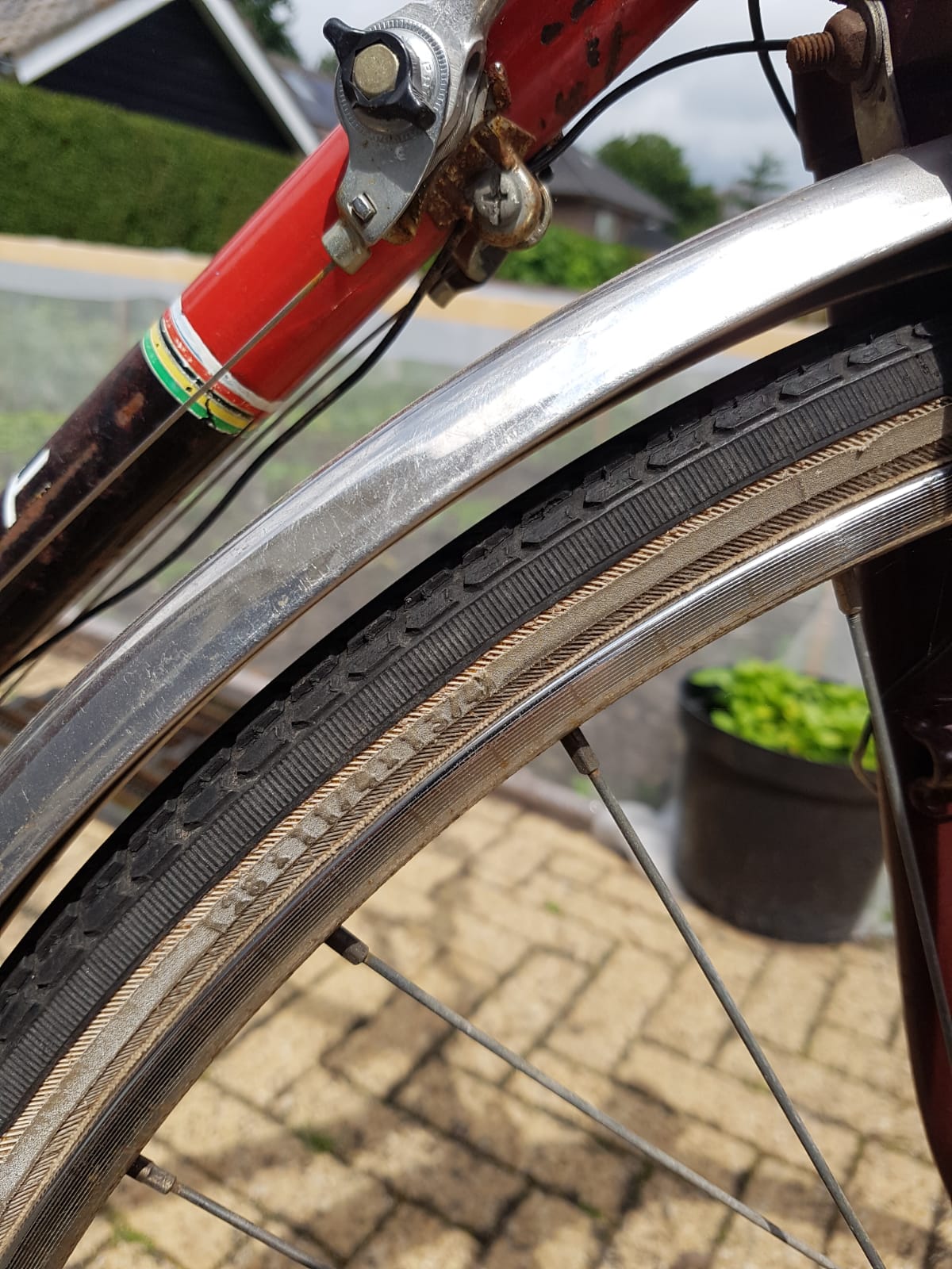Mijn vader heeft zijn oude gazelle nog staan. Hij denkt dat hij ongeveer 40 jaar oud is. Ik heb er zelf in het verleden al op gefietst en dat ging goed. Echter heeft hij ondertussen wel wat opknapwerk nodig. Er is ooit een andere voorvork op geplaatst waardoor de remblokjes nu op de band remmen en niet meer op de velg.