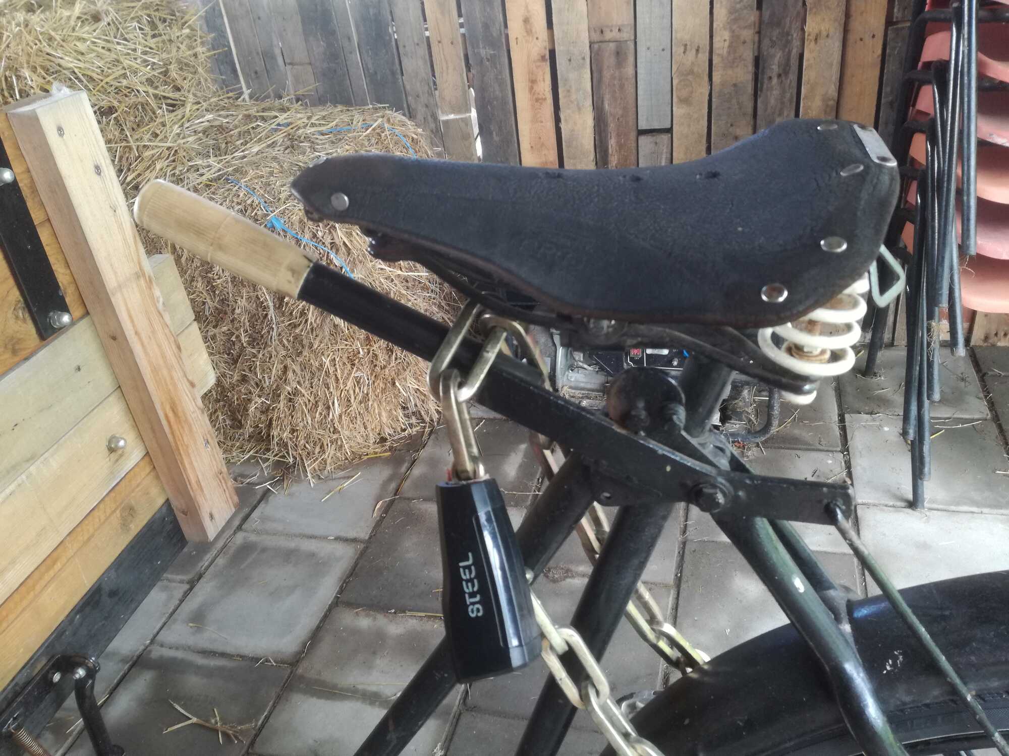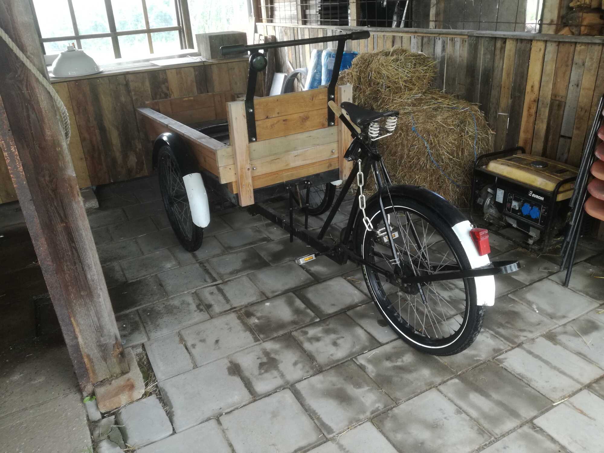 Aan het kokerbalkframe kan ik zien dat het geen hEEl oude is, maar ben wel nieuwsgierig. Er is wel het een en ander, waaronder het remsysteem, op betrekkelijk vernuftige wijze -zij het met wat minder respect voor de originaliteit- aan verbouwd. Hij heeft drie 26" wielen.