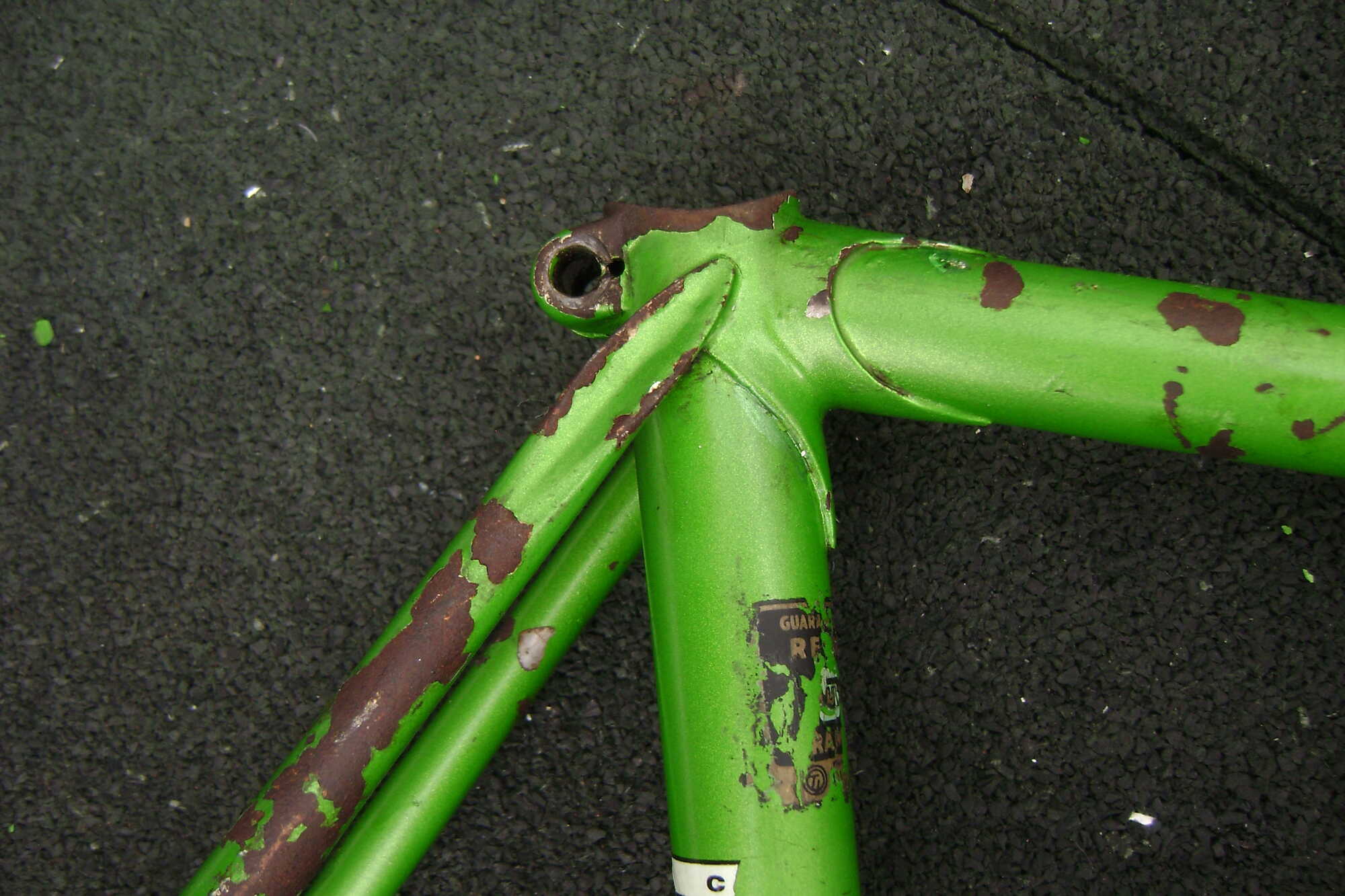 Ik kwam dit jaren 70 racefietsframe tegen. Mooi gemaakt, licht en volgens de sticker van Reynoldsbuis. 27.2 mm zadelpen. Campagnolo patten zonder spatbordoogjes. Vork en frame gemerkt met een 6 of een 9.
