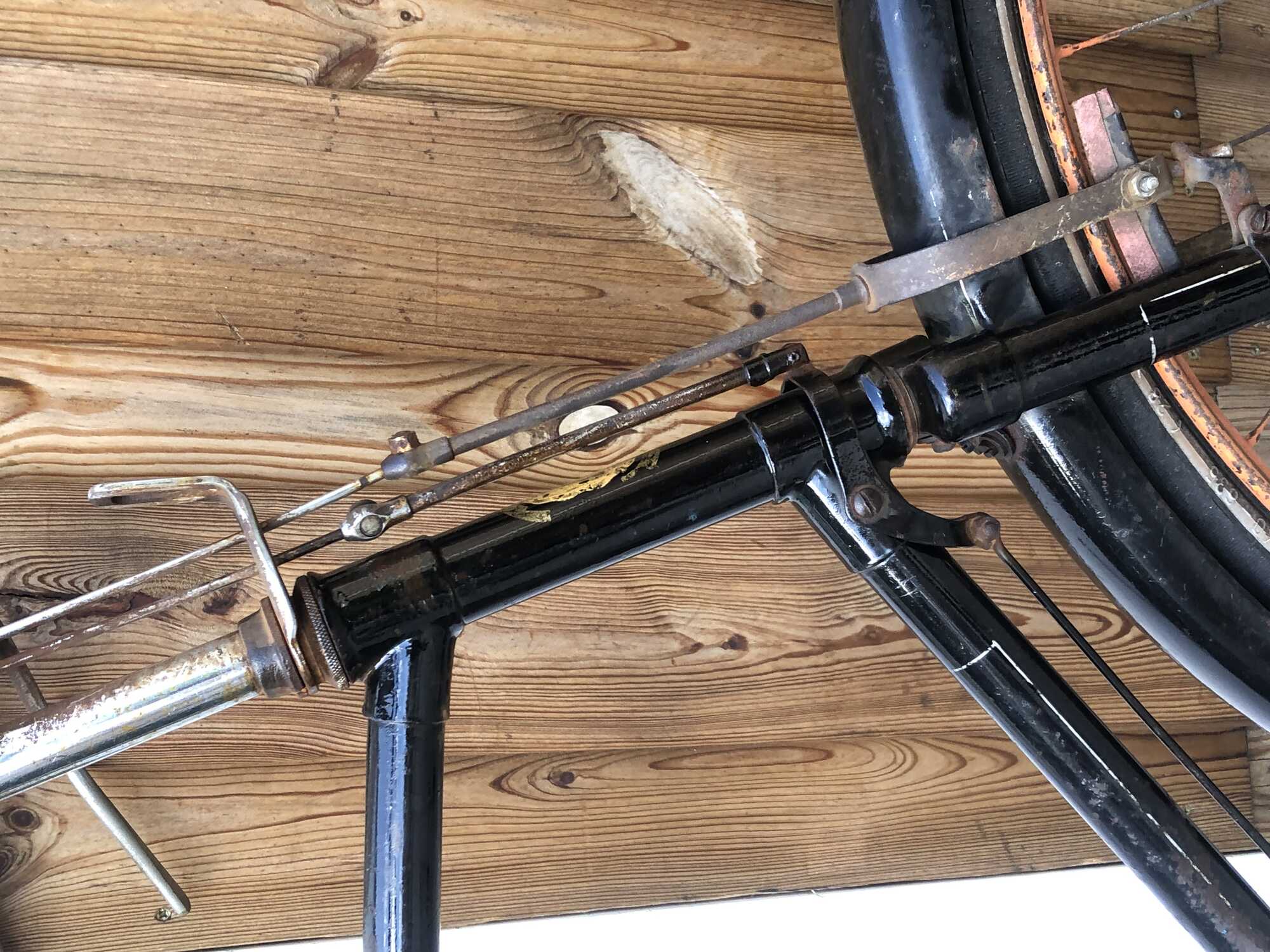 Ook de voorvork en de beugels voor de rem zien eruit als onderdelen van jaren 30/40 fietsen. Jaren 50 zien de optrek rem beugels er niet weer iets anders uit.
